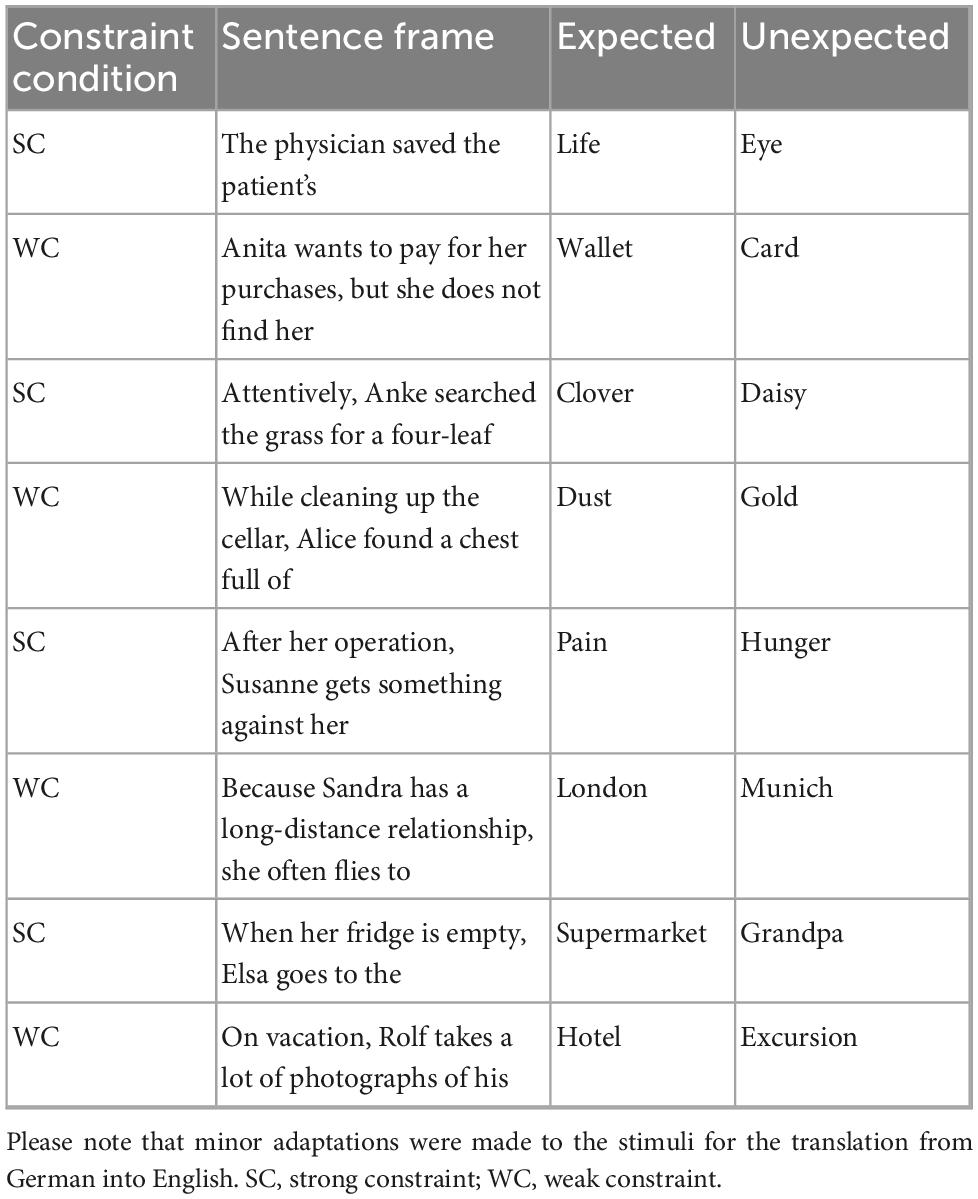 In the experiment, a total of 200 sentence frames were utilized, half of which were strongly constraining (SC) regarding the final word. Constraint was determined through cloze probabilities obtained in a separate norming study detailed in our prior work (Höltje and Mecklinger, 2022). The remaining frames were weakly constraining (WC), lacking a specific expectation for the final word. In this study, cloze probabilities for expected target words were ≥0.60 (M = 0.86, SD = 0.12) for SC frames and ≤0.45 (M = 0.26, SD = 0.09) for WC frames. Sentence lengths were matched between the two constraint types.