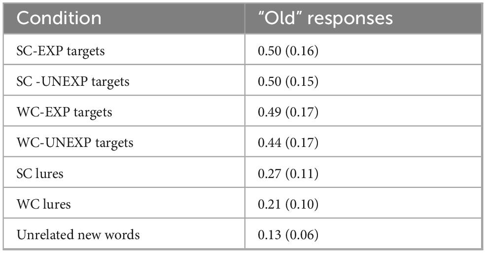 The study revealed a high proportion of correct responses to comprehension questions during the study phase (M = 0.90, SEM = 0.01), indicating participants’ compliance with instructions and their attentiveness to sentence content. Individual binomial tests confirmed that each participant’s accuracy in the responses to the comprehension questions was significantly above chance. During the test phase, Pr scores (M = 0.28, SEM = 0.02) significantly exceeded zero, t(35) = 12.85, p < 0.001, d = 2.14, suggesting participants effectively distinguished between studied target words and new words. Mean hit rates and false alarm rates for each condition are detailed in Table 2. Log-transformed and scaled word frequency values for each condition: M = 1.26, SD = 0.70 (SC-EXP); M = 1.18, SD = 0.72 (SC-UNEXP); M = 1.25, SD = 0.68 (WC-EXP); M = 1.33, SD = 0.59 (WC-UNEXP).