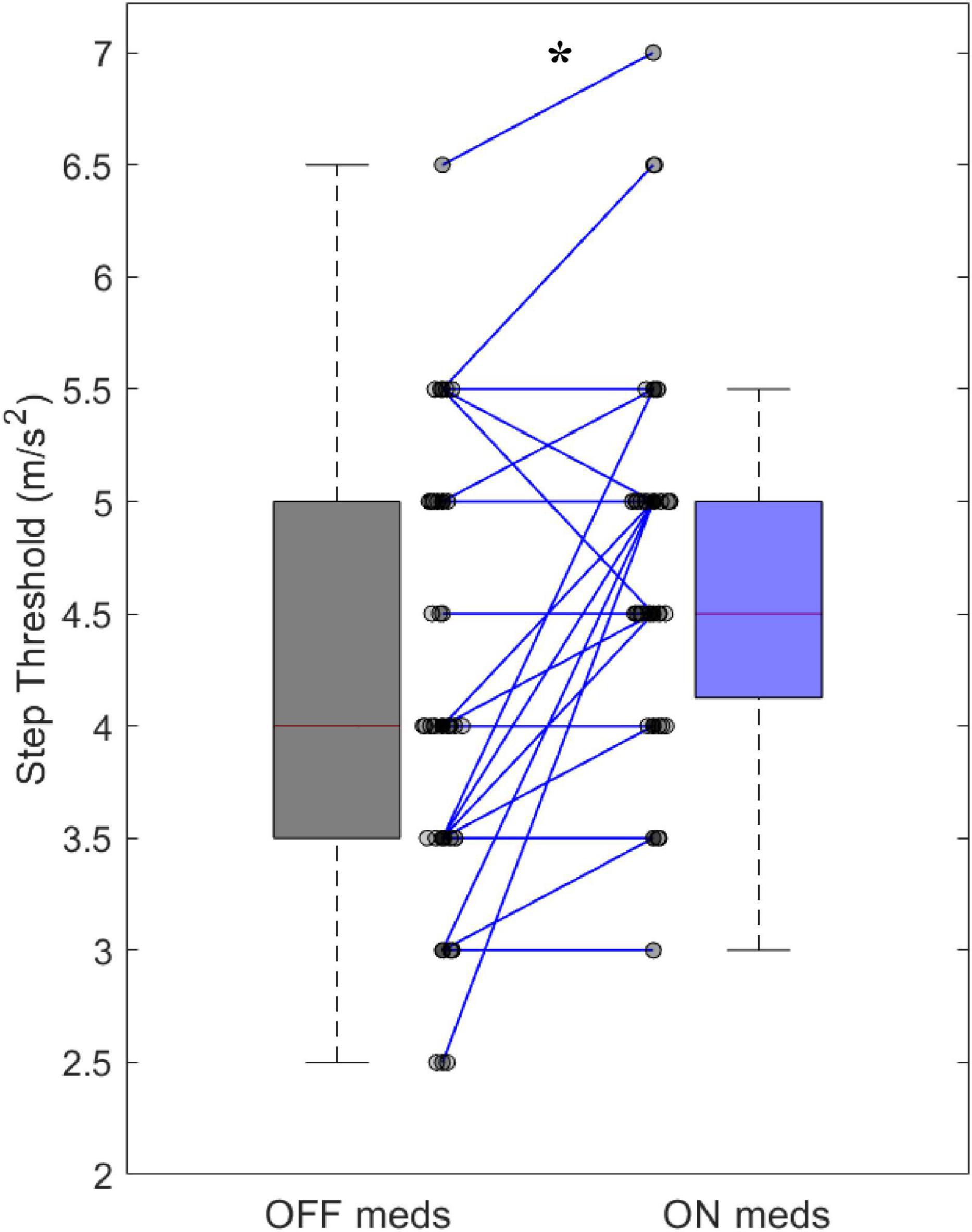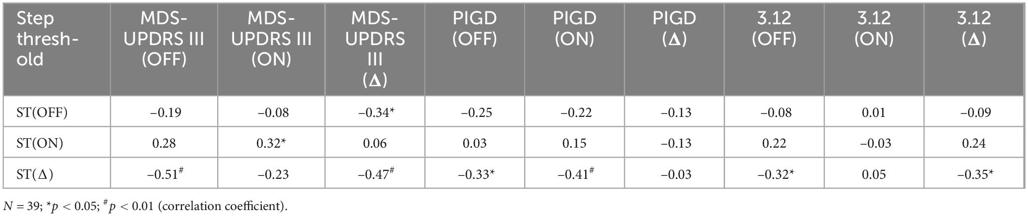 Improvements in clinical measures of motor function related to our step threshold measure. Step thresholds increased with dopaminergic medications (OFF: 4.15 ± 0.92 ms–2, ON: 4.69 ± 0.77 ms–2, p < 0.001) (Figure 2). The medication-mediated change in step threshold correlated to the change in MDS-UPDRS part III (r = –0.47, p < 0.01) (Table 3) and to the change in MDS-UPDRS 3.12 postural instability subscore (r = –0.35, p < 0.05) (Table 3). The medication-mediated change in step threshold did not significantly correlate to the change in PIGD (r = –0.03, p > 0.05) (Table 3). The association between the change in step threshold and a change in the tremor score was not significant (r = –0.27, p > 0.05).