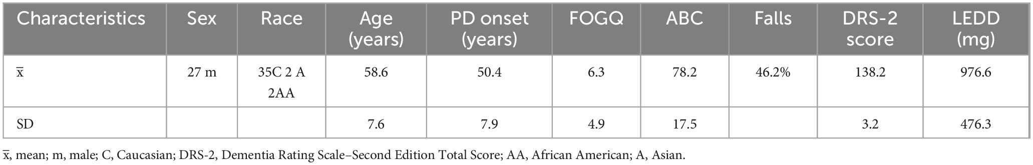 Thirty-nine individuals diagnosed with idiopathic PD were included in this institutionally approved study (Table 1) (mean age: 63 years ± 8, UPDRS OFF medication: 49 ± 13) as part of a clinical trial, the SUNDIAL Trial, a longitudinal deep brain stimulation (DBS) study (clinicaltrials.gov NCT03353688). All assessments were completed prior to DBS surgery. Participants in this study were approached after recommendation from a multidisciplinary Movement Disorders committee for unilateral subthalamic nucleus DBS as part of routine care. Inclusion required ≥ 30% improvement in the Movement Disorder Society-Sponsored Revision of the Unified Parkinson’s Disease Rating Scale (MDS-UPDRS) part III on dopaminergic medications versus the practically defined “OFF” state (≥ 12 h OFF medications), Hoehn and Yahr score > 1, and Dementia Rating Scale-2 score ≥ 130. Exclusion criteria included duration of disease < 4 years, and no history of stroke or other significant neurological conditions. To evaluate global cognition in Parkinson’s disease, all participants completed the Dementia Rating Scale–Second Edition (DRS-2), which has been found to be a valid global cognitive screener in PD (Lopez et al., 2023). This was included to ensure PD patients with dementia were not included in the DBS trial.