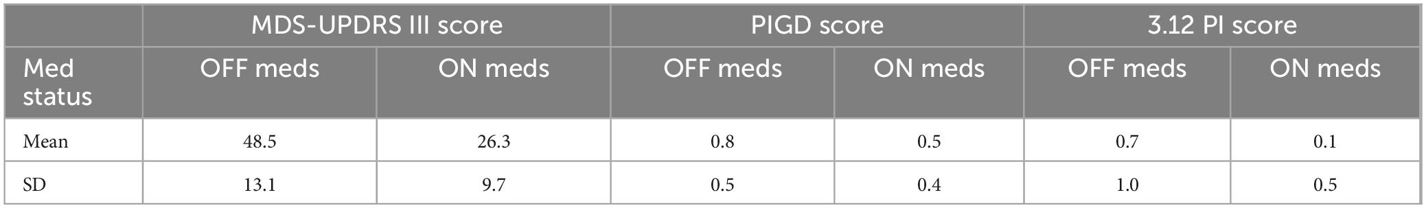 Demographic data for participants in this study are presented in Table 1. Forty-six percent of patients with PD reported a fall in the past 12 months. In addition, scores for FOGQ, ABC, and DRS-2 scores are reported in Table 1. Clinical scores showed an improvement for overall MDS-UPDRS total (OFF: 81.7 ± 23.0, ON: 59.6 ± 19.2, p < 0.001) (Table 2); MDS-UPDRS part III (OFF: 48.5 ± 13.1, ON: 26.3 ± 9.7, p < 0.001) (Table 2); and MDS-UPDRS 3.12 postural instability (OFF: 0.7 ± 1.0, ON: 0.1 ± 0.5, p < 0.001) (Table 2). The MDC value of step threshold that reflects a true change in task performance is estimated to be 0.46 ms–2.