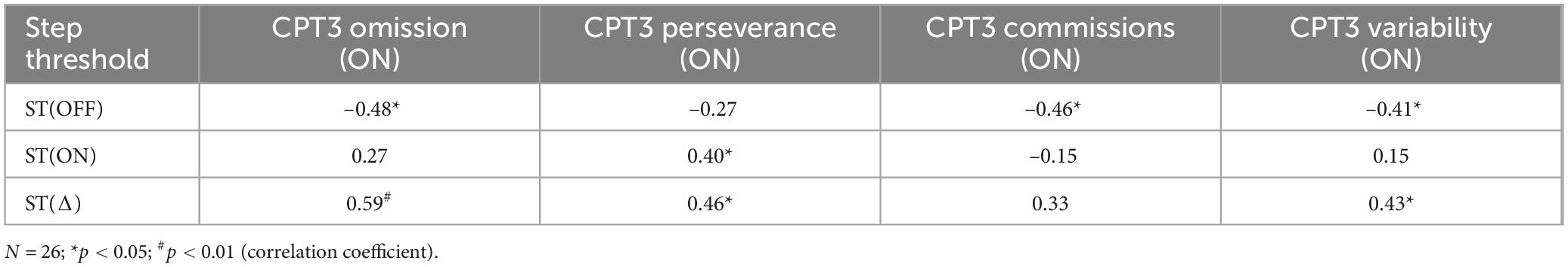 Step threshold scores for participants OFF or ON dopaminergic medication were significantly correlated with measures from CPT-3 testing while participants were ON dopaminergic medication. Step threshold OFF medication correlated with all three CPT-3 outcomes (p < 0.04 for all comparisons) (Table 4). The correlation between step threshold and CPT-3 perseverance T-score was not statistically significant (p = 0.06) (Table 4). The difference in step threshold with medication (ON vs. OFF) was significantly correlated to CPT-3 Omission T-score), CPT-3 perseverance and the CPT-3 Variability score (p < 0.03 for all) (Table 4). The correlation between step threshold and CPT-3 Commission T-score was not statistically significant (p = 0.06) (Table 4).
