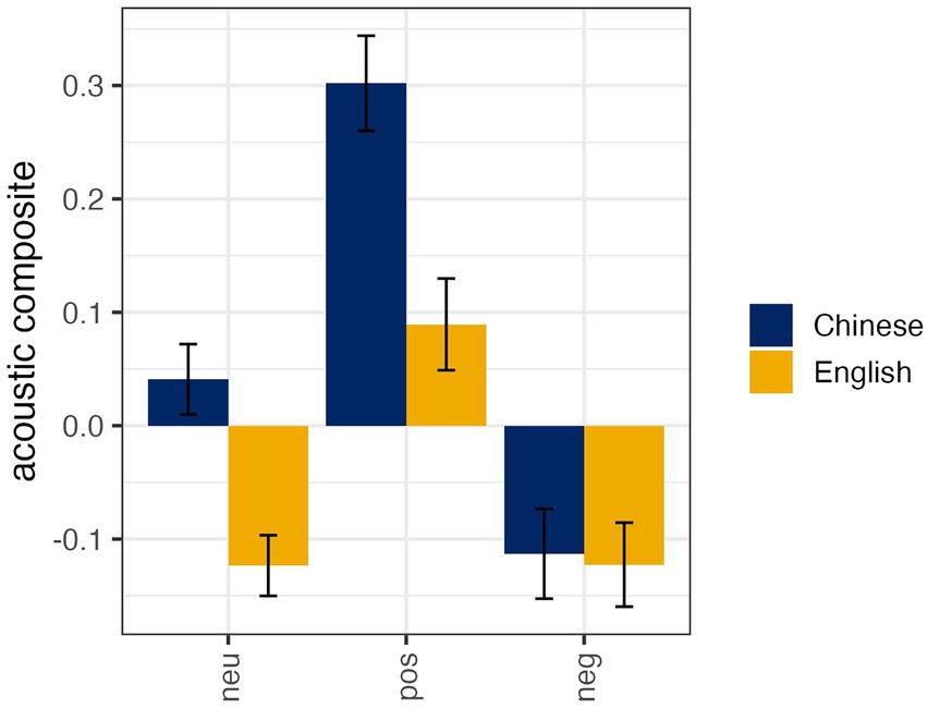 Figure 1. Mean acoustic composite scores (duration, intensity, and pitch [fo]) with standard errors for the two-way interaction effect associated with the Language (Chinese, English) by Affective Expressions (neutral, negative, positive). Higher composite values indicate longer durations, greater vocal intensity, and higher pitch—this is most clearly seen in positive Chinese utterances.