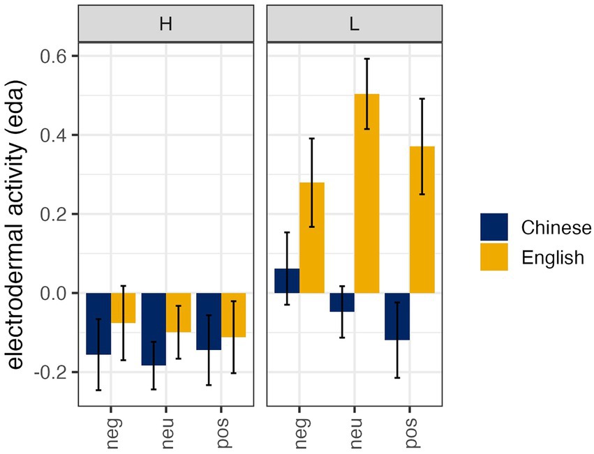 Figure 2. Mean electrodermal activity (EDA) with standard errors across languages (Chinese, English), affective expressions (neutral, negative, positive), and immersive experience length (high >12 months, low <12 months). Positive values indicate higher physiological arousal. The figure has two panels for immersion level (high = H, low = L), showing most prominently that low-immersion participants exhibited the highest EDA for English neutral words.