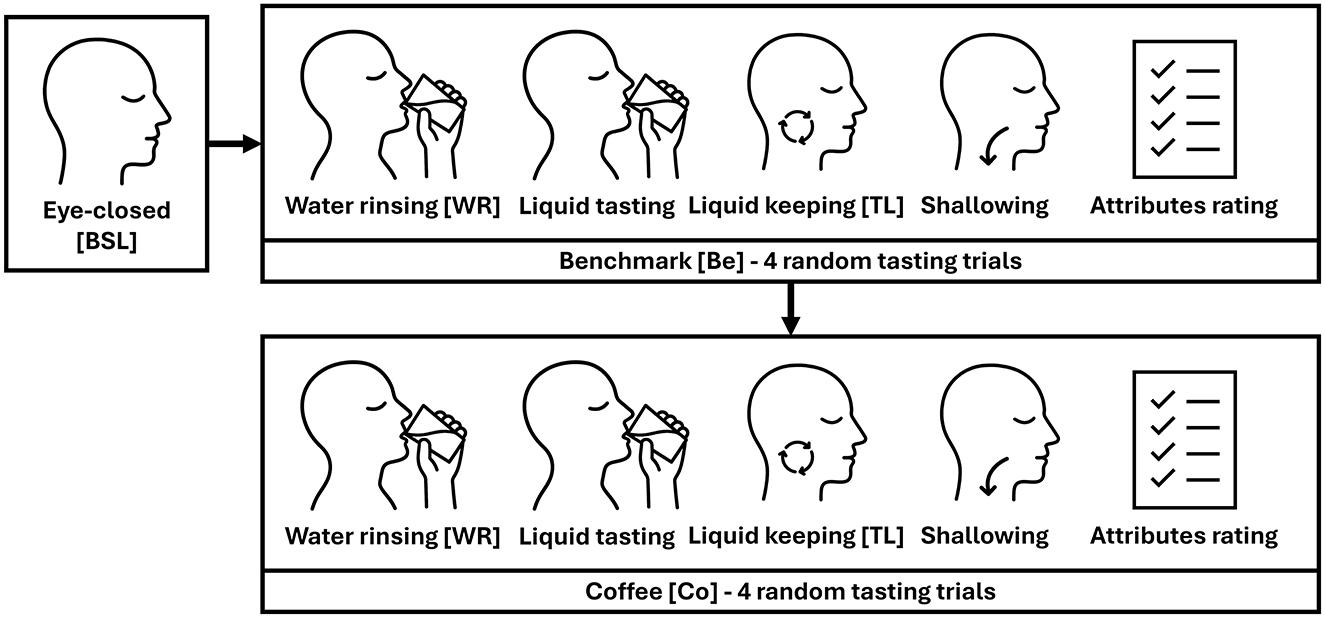 The administration of liquids was masked. The Be solutions were served at room temperature, while the Co at approximately 60°C. According to Di Flumeri et al. (2017), participants were instructed to rinse the palate with a glass of water before any tasting trial (WR task) and to keep the liquid (solution or coffee) in the mouth for 10s (TL task) before swallowing. At the end of each tasting trial, subjective ratings for bitter, astringent, sweet, and acid attributes were collected on a 0 − 10 scale.