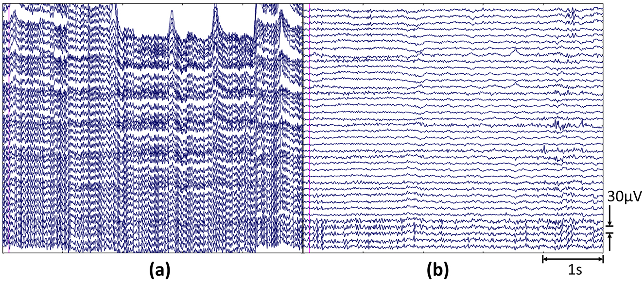 Figure 2. Representative 5s−long segments showing the (a) raw and (b) pre-processed EEG signal. The data refer to the TL task of As solution, with onset marked by the pink vertical line.