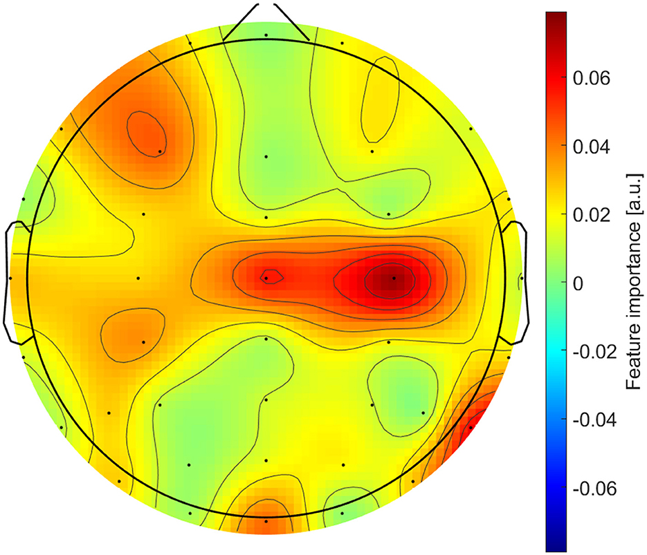 The topographic plot in Figure 3 qualitatively identified central, occipital, parietal, and frontal regions as most important for the overall prediction.