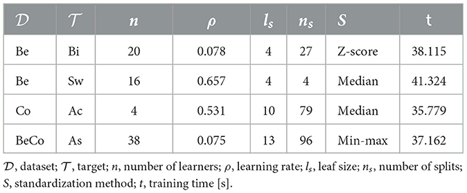 The selected model was LSBoost, a least-squares variant of Boosted Trees (Friedman, 2001). It was chosen for the enhanced predictive performance, as a non-linear ensemble method, and because it incorporates feature selection within the weak learners (Decision Trees, DTs). Regressors belonging to the boosted trees family have been previously shown to outperform in EEG prediction tasks (Hussain et al., 2019; He et al., 2022; Isabona et al., 2022).
