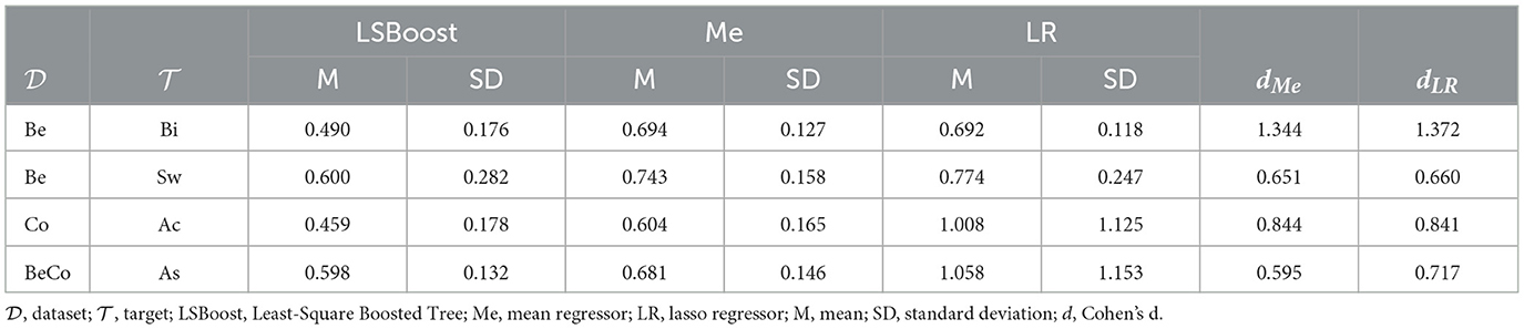 The cross-validated MAEs of LSBoost vs. Me and LBoost vs. LR were compared by means of the following Cohen's d-scores (Goulet-Pelletier and Cousineau, 2018):