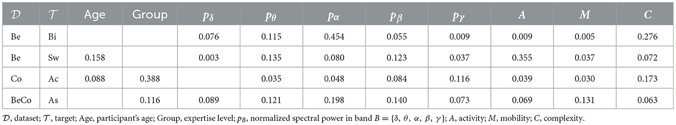 Both spectral and temporal features contributed to the predictions, but their importance scores varied substantially across datasets and targets. The highest median score was observed for pα (Med = 0.139, IQR = 0.190), whereas the lowest was for M (Med = 0.034, IQR = 0.037). Age and Group appeared as predictors in two models each: Age in Sw with Be and Ac with Co, while Group in Ac with Co and As with BeCo. Group achieved the highest importance, not only compared to Age but also across all features (Med = 0.252, IQR = 0.136). Table 3 summarizes the channel-averaged feature importance scores, split by dataset and target.