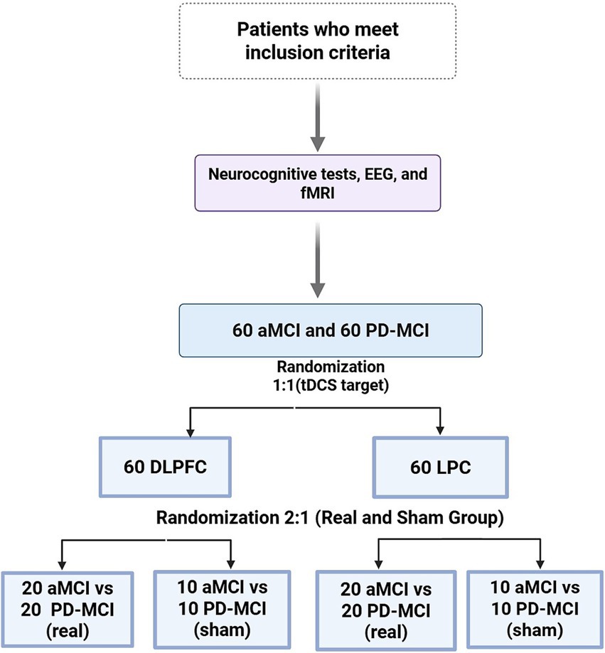 Figure 1. Study design and group allocation. Flowchart illustrating the study design for participants meeting inclusion criteria. Initial neurocognitive assessments, EEG, and fMRI were performed on 60 individuals with aMCI and 60 with PD-MCI. Participants were randomized in a 1:1 ratio to receive tDCS targeting either the DLPFC or the LPC. Within each stimulation arm, participants were further randomized in a 2:1 ratio to the Real or Sham tDCS condition, yielding 20 aMCI and 20 PD-MCI (real) versus 10 aMCI and 10 PD-MCI (sham). Created with BioRender.com.