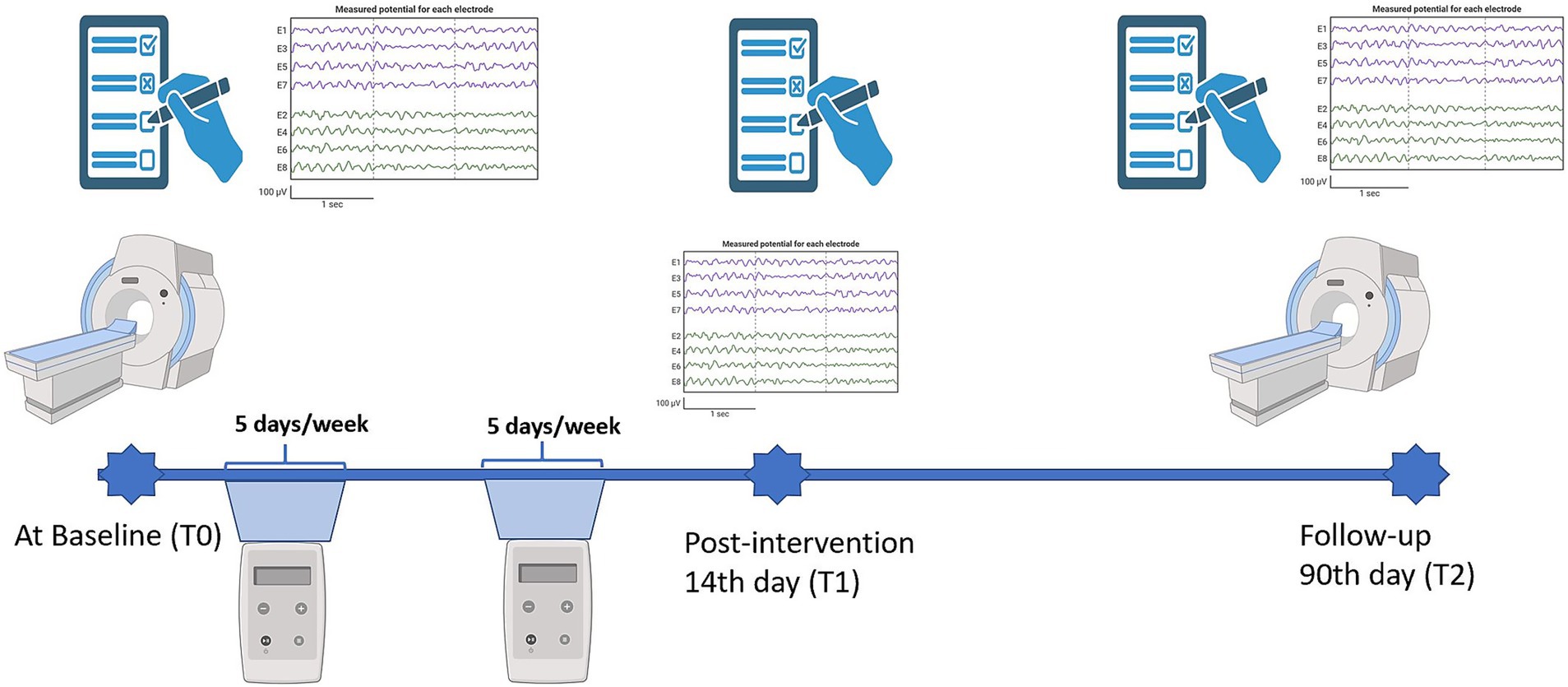Figure 2. Timeline of the tDCS intervention protocol. Assessments were conducted at three time points: baseline (Day 0, T0), post-intervention (Day 14, T1), and follow-up (Day 90, T2). Cognitive testing and electroencephalography (EEG) were performed at each time point, while functional magnetic resonance imaging (fMRI) was performed at baseline and follow-up. Participants received tDCS sessions five days per week between baseline and post-intervention. Created with BioRender.com.