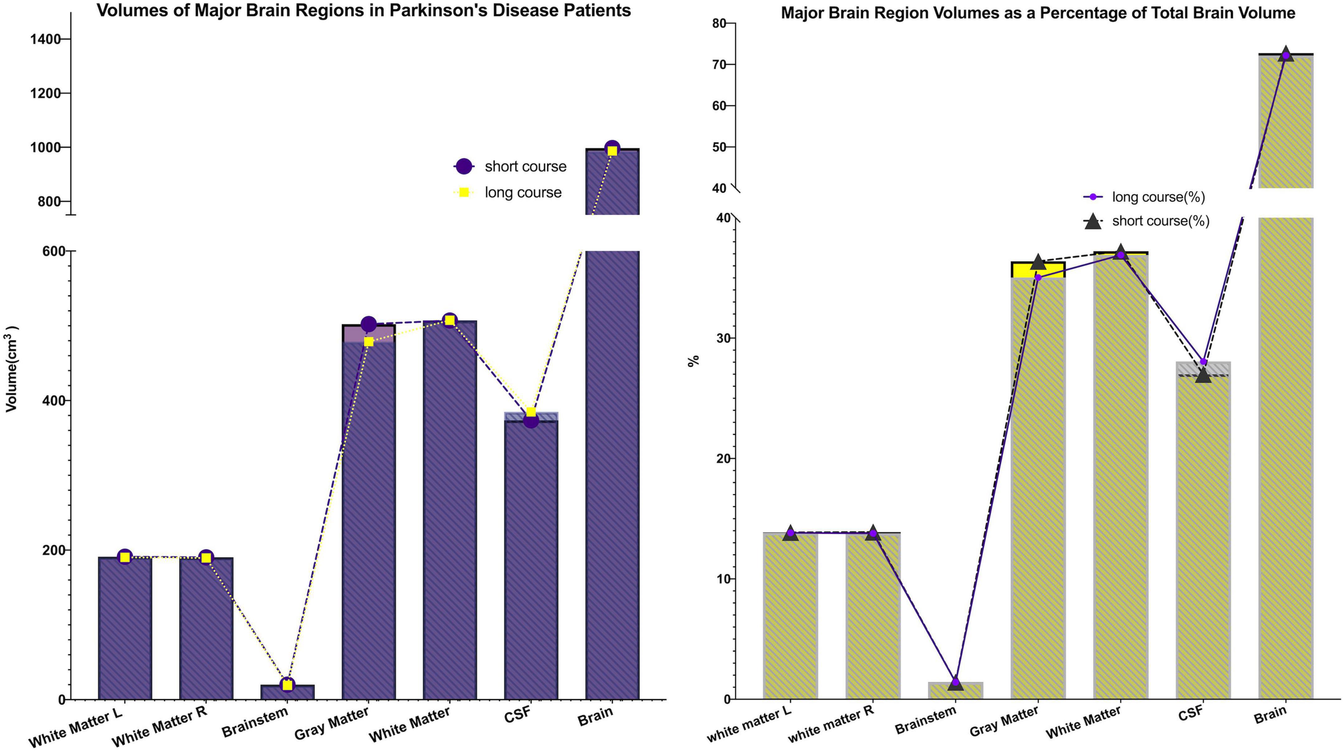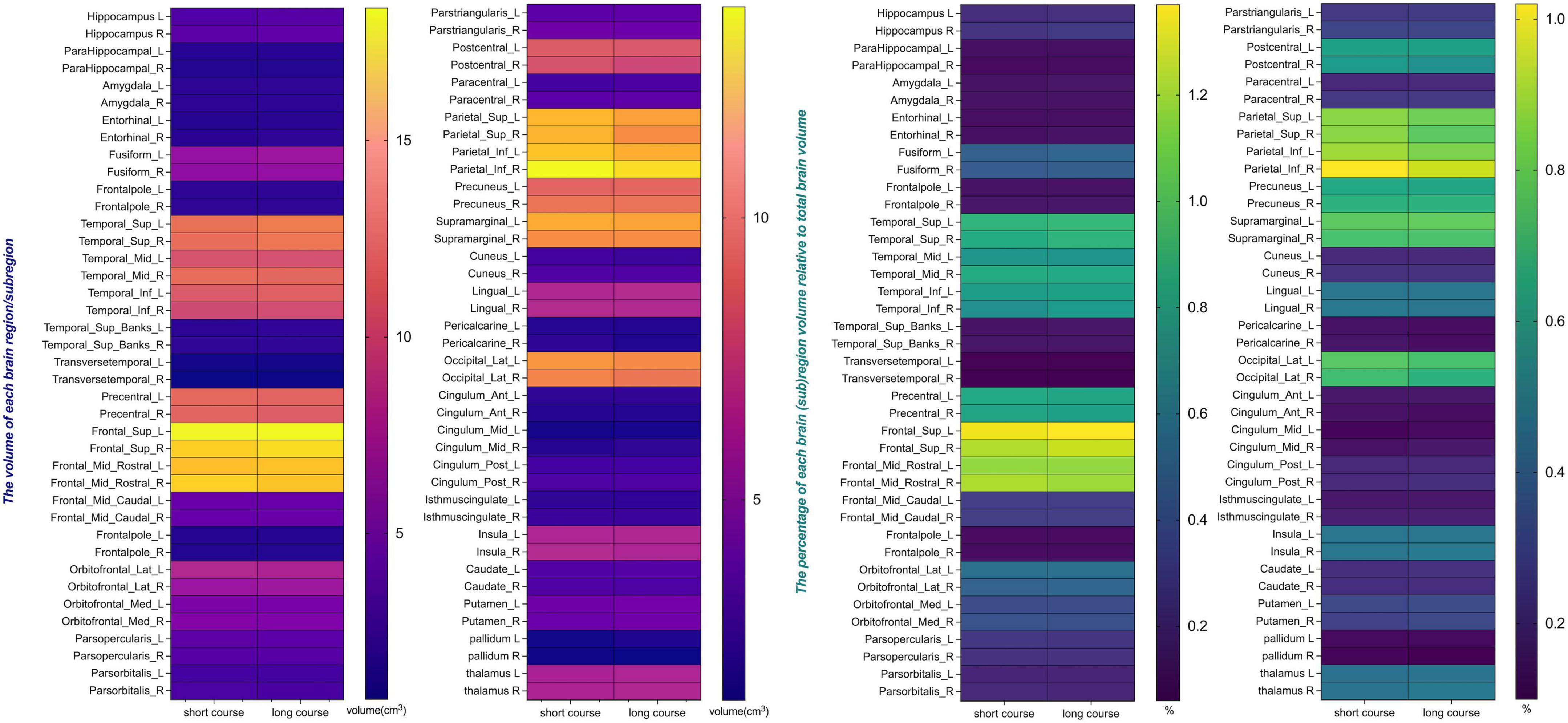 Figure 2. The volume and the percentage of each brain region/subregion volume relative to total brain volume. The heat map presents the volumes of individual brain subregions and their proportions of total brain volume in PD patients at different stages, providing essential data for further statistical analysis. Certain subregions show reduced volumes in long-term patients, indicating possible atrophy linked to disease progression.