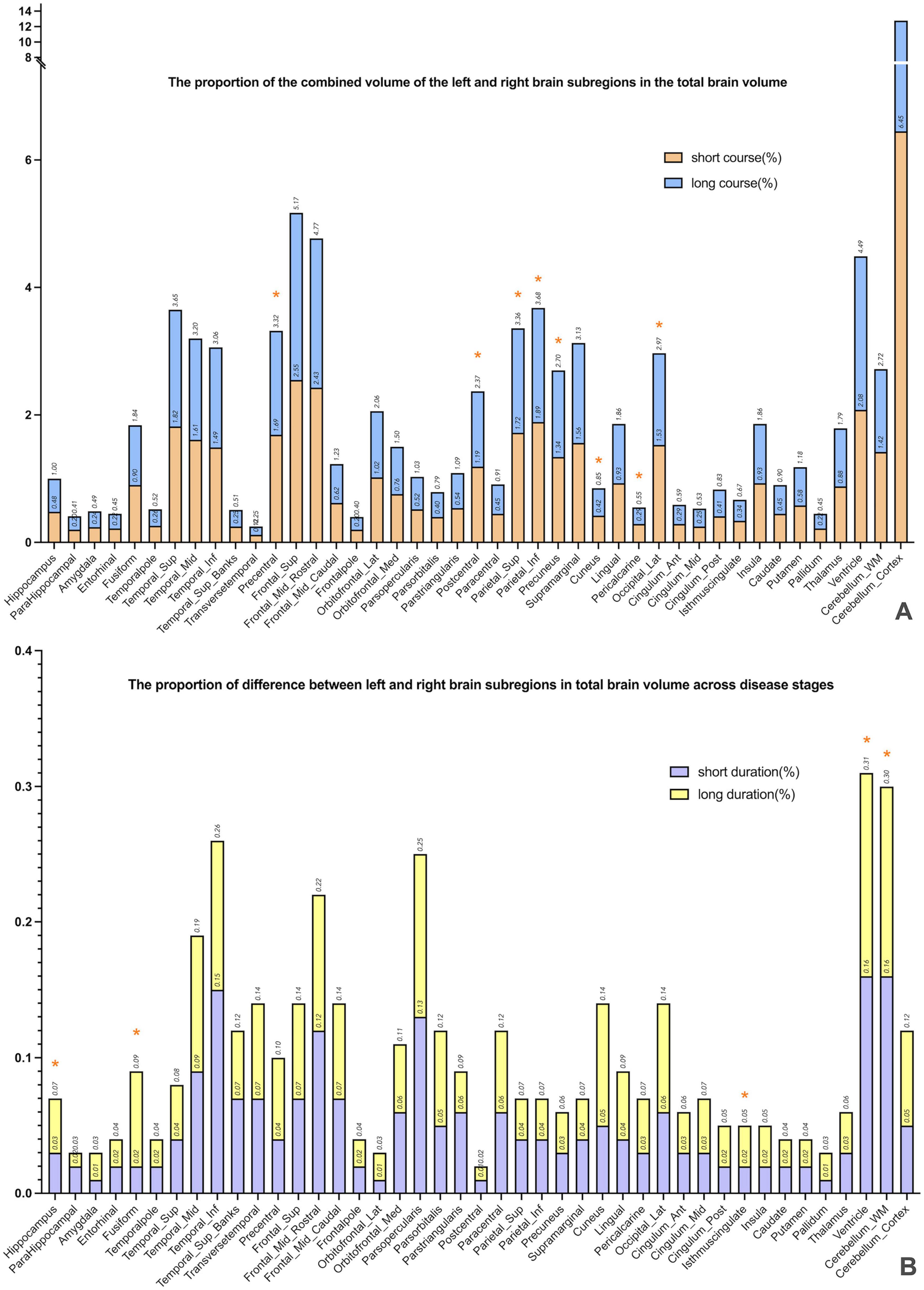 Figure 4. The combined volume and absolute difference between the left and right subregions, expressed as a percentage of total brain volume. (A) Presents a comparison of volume ratios of specific brain regions across different disease duration groups. By calculating the combined volume of left and right subregions relative to total brain volume, the study preliminarily identified brain regions potentially exhibiting progressive atrophy. The results revealed that in the long-duration group, the volume ratios of the bilateral precentral gyrus, superior parietal lobule, and precuneus—regions associated with motor-cognitive functions—were significantly lower than those in the short-duration group (* marked), indicating possible atrophy in these areas during disease progression. (B) Further investigates whether brain atrophy demonstrates lateralized progression. The analysis calculated the absolute volume differences between left and right subregions, expressed as a proportion of total brain volume. Findings showed greater left–right asymmetry in the hippocampus, fusiform gyrus, isthmus of the cingulate gyrus, and cerebellar white matter among patients with longer disease duration (* marked), suggesting a potential pattern of asymmetric atrophy in these regions.