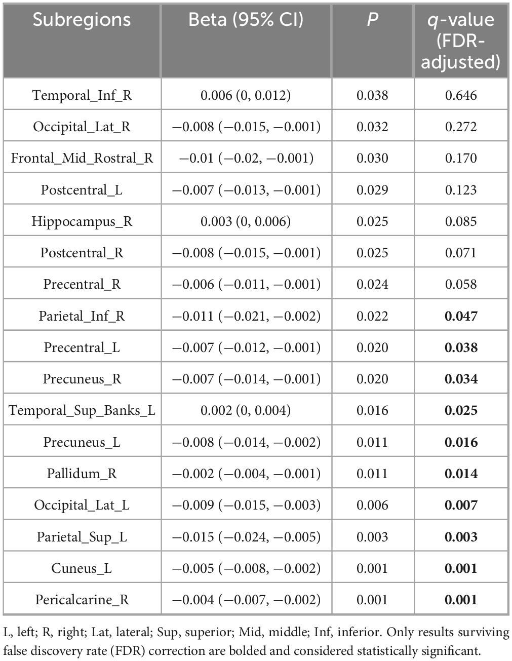 Following FDR correction, significant associations between disease duration and regional brain volumes were observed in the following subregions: left precentral gyrus, left superior and right inferior parietal lobules, bilateral precuneus, left cuneus, right pericalcarine cortex, left lateral occipital gyrus, and right globus pallidus (FDR-corrected q < 0.05). Additionally, positive associations were identified in the left superior temporal gyrus (FDR-corrected q < 0.05). Full details of the FDR-adjusted q-values are presented in Table 2.