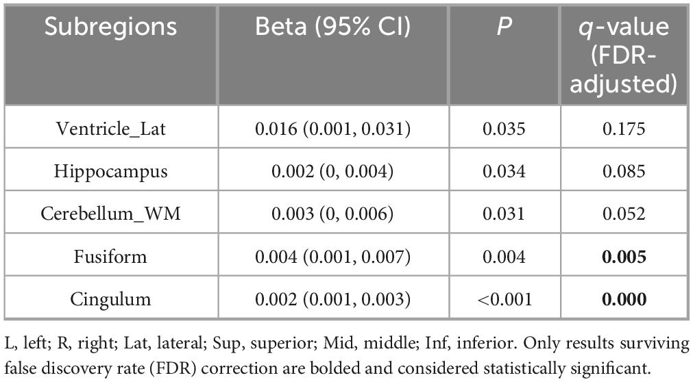 It is important to note that this study applied FDR correction to address the issue of multiple comparisons across numerous brain subregions. While this method effectively reduces the risk of Type I errors, it simultaneously raises the threshold for statistical significance, thereby increasing the likelihood of false negatives. As a result, certain regional volume changes that did not survive FDR correction may still reflect biologically meaningful patterns. These findings, though not statistically significant after correction, could represent potential neuroanatomical trends and warrant further investigation in future studies with larger sample sizes or through meta-analytic approaches.