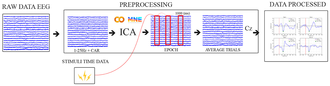 The data processing is illustrated in Figure 3, based on a literature review (Luck, 2014; Varghese et al., 2017), with a focus on removing low-frequency noise, attenuating frequencies above 25 Hz. First, a high-pass filter at 0.1 Hz was applied to attenuate DC and low-frequency noise in raw EEG data, and a band-pass filter of 1–25 Hz was used, followed by a CAR filter to remove common noise.