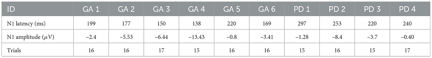 Although in our study, the N1 amplitude did not differ significantly between groups (GA: –5.33 ± 4.46 μV; PD: –3.45 ± 3.58 μV), its low magnitude suggests the perturbations may not have been sufficiently challenging to fully engage cortical responses. The values were significantly lower than those reported in the literature (Varghese et al., 2017).