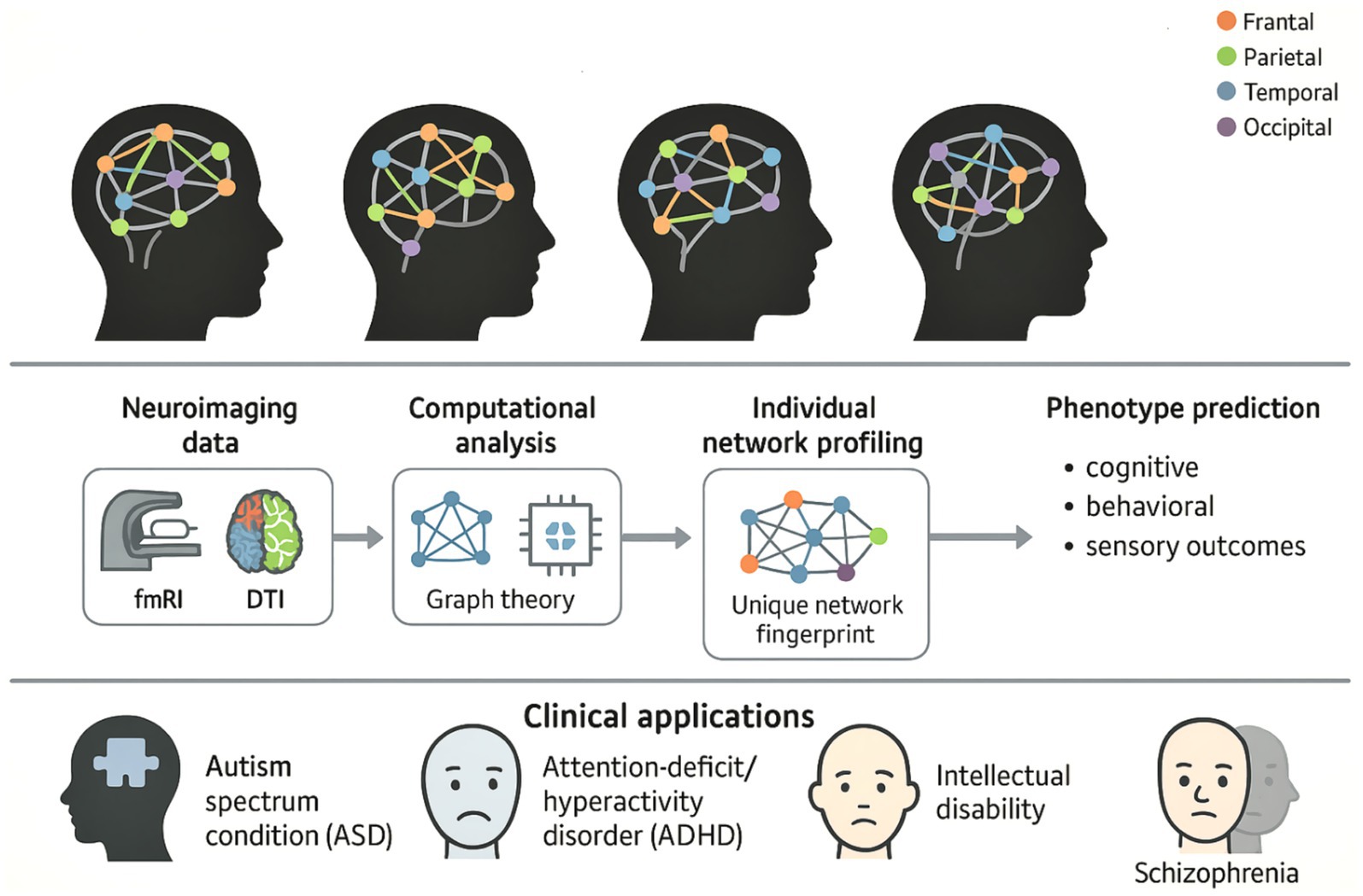 This figure illustrates the comprehensive workflow for applying precision neurodiversity through Personalized Brain Network analysis, highlighting how individual neurological differences can be characterized as adaptive variations rather than pathological ones. The top panel displays four brain symbols representing different individual brain network architectures, each with unique connections between color-coded brain regions (frontal: orange, parietal: green, temporal: blue, occipital: purple), illustrating the concept of neurological diversity, where each person has a unique “neural fingerprint.” The middle panel illustrates the methodological workflow that progresses through the acquisition of neuroimaging data (fMRI and DTI), computational analysis using graph theory, extraction of individual network profiles to identify unique network characteristics, and phenotype prediction, which enables accurate predictions of cognitive, behavioral, and sensory outcomes. The lower panel shows clinical applications for major neurodevelopmental diseases, such as autism spectrum disorder (ASD), ADHD, intellectual impairment, and schizophrenia, which represent a paradigm shift toward individualized, data-based approaches that celebrate neurodiversity while enabling accurate, personalized interventions based on the unique structure of each individual’s brain network.