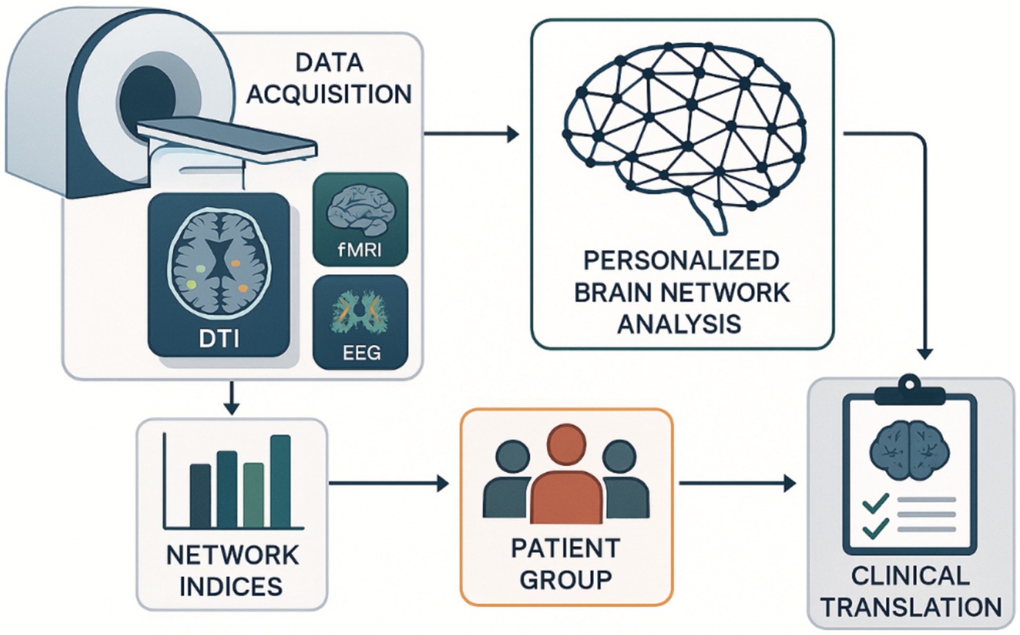 The workflow integrates multi-modal neuroimaging data acquisition (MRI, DTI, fMRI, EEG) with computational network analysis to generate personalized brain connectivity profiles. Network indices are calculated for patient cohorts, enabling targeted clinical translation through individualized neurological assessments and therapeutic interventions based on cognitive variability patterns. Diffusion Tensor Imaging (DTI): Diffusion Tensor Imaging; EEG: Electroencephalography; fMRI: Functional Magnetic Resonance Imaging.