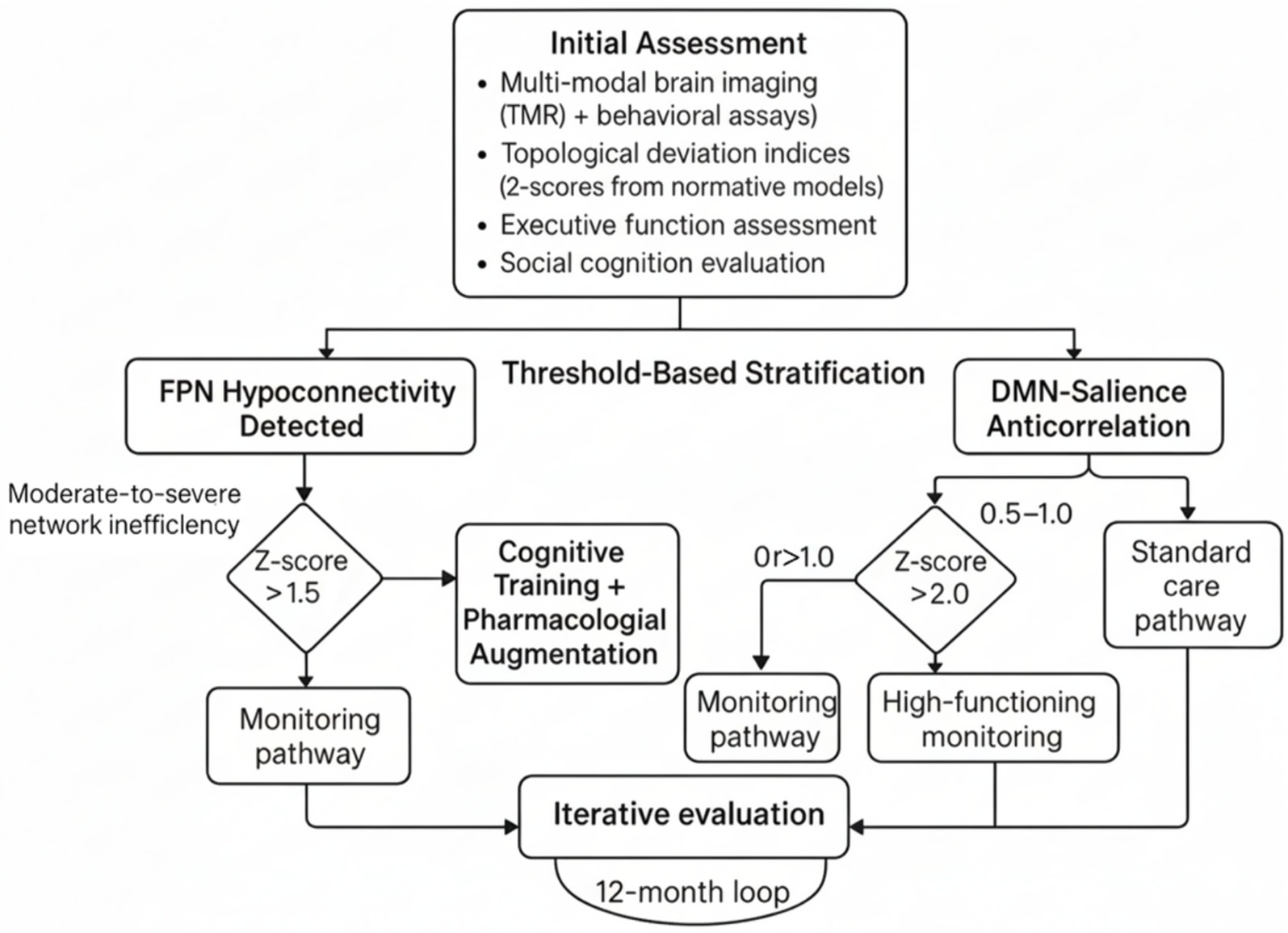 Figure 3. Precision-based network (PBN) clinical pathway decision tree. This decision tree illustrates a threshold-based stratification protocol for personalized neurodiversity interventions derived from an initial multimodal assessment. This assessment includes functional Magnetic Resonance Imaging (fMRI), behavioral assays, topological deviation indices (z-scores from normative connectome models), executive function evaluations, and social cognition testing. The first step involves detecting frontoparietal network hypoconnectivity and identifying moderate-to-severe network inefficiency indicated by a z-score greater than 1.5. The relationship between the default mode network (DMN), the salience network, and disease severity is also considered. Based on these metrics, patients are selected for different monitoring pathways: those with mild deviations are monitored, those with moderate inefficiency receive cognitive training plus medication, high-functioning individuals with borderline anticorrelation are monitored, and standard care is provided for severe z-scores greater than 2.0. A 12-month evaluation loop reassesses and adjusts pathways to support the adaptive and personalized management of neurodevelopmental variability.