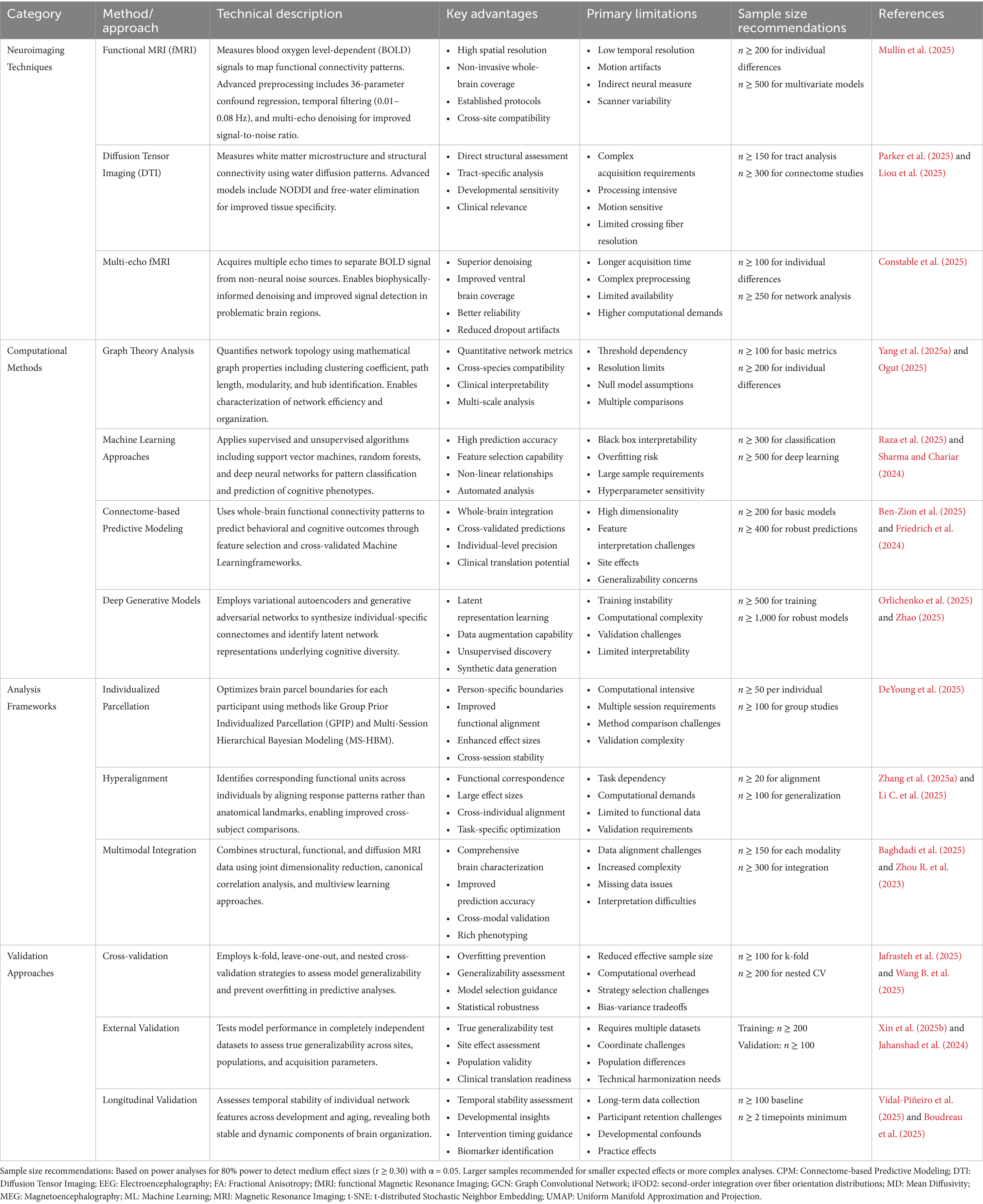 Functional magnetic resonance imaging (fMRI) underpins PBN analysis and has undergone significant methodological advancements in recent years (Yen et al., 2023). Advanced methods use non-negative matrix factorization to clarify individual differences in cortical organization across various spatial scales, from coarse resolution (two networks) to acceptable resolution (30 networks) (Han et al., 2023; Wen et al., 2023). This approach employs group consensus rules to maintain cross-individual correspondence and data area rules to ensure spatial coherence (Han et al., 2025). Recent developments have focused on surface processing pipelines that retain individual cortical geometries (Goncalves et al., 2025). Enhanced preprocessing protocols utilize a complex motion correction strategy, including a 36-parameter differential regression model and a temporal filter (0.01–0.08 Hz), to improve signal quality while preserving individual differences (Mullin et al., 2025). Deep neural network architectures specifically designed to identify individuals from resting-state functional connections have shown that PBN fingerprints can be extracted with remarkable precision (Lee and Lee, 2024). The landscape of personalized brain network analysis features a range of complementary approaches, each providing unique advantages in identifying individual differences in brain organization (Kong and Jin, 2025; Karimi et al., 2025). Table 1 presents a comprehensive overview of the current methods, including neuroimaging techniques, computational methods, analytical frameworks, and validation strategies. This section outlines the main features, limitations, and recent advancements in this field.
