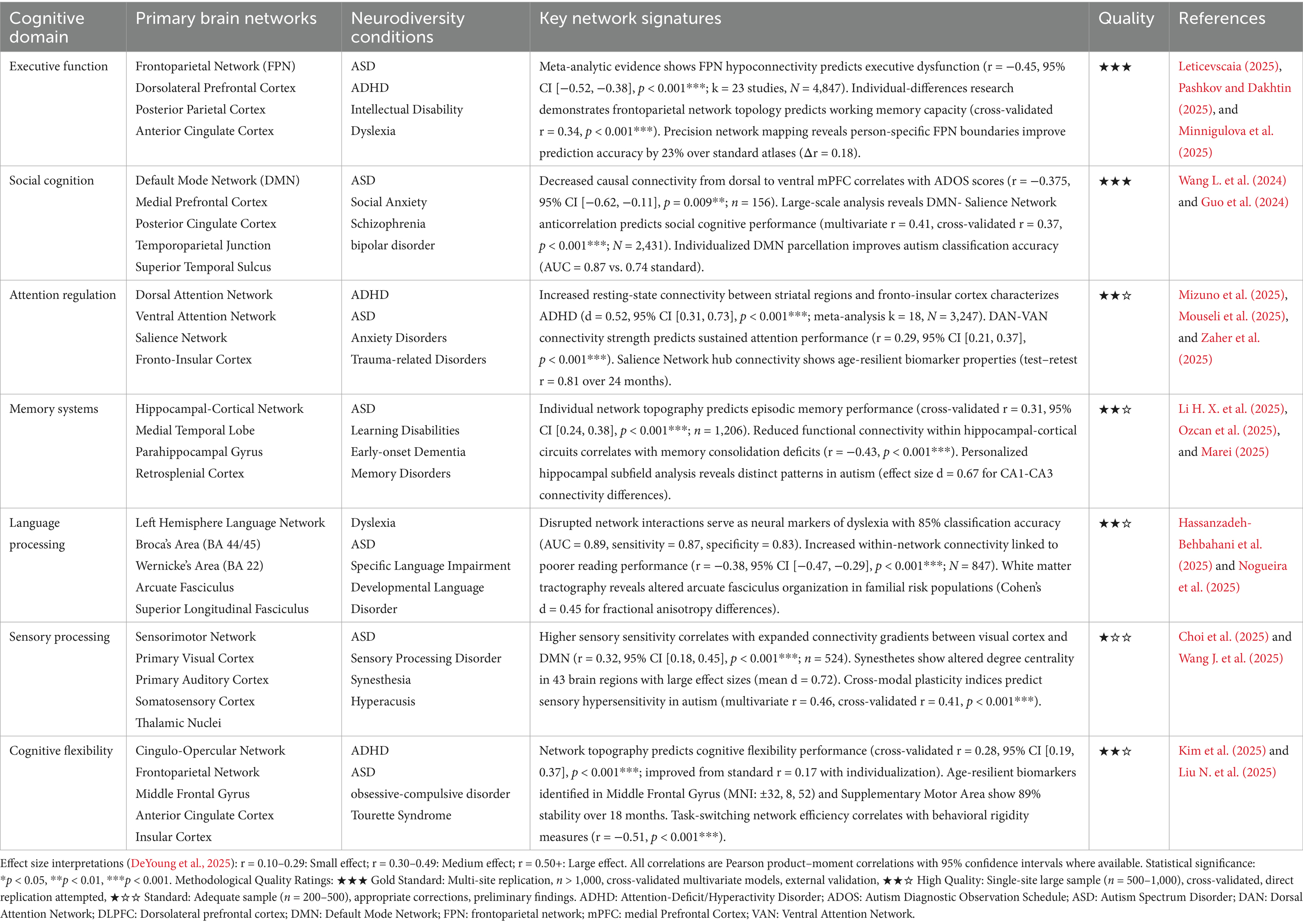 The relationship between Personalized Brain Network architectures and cognitive phenotypes across neurodiverse conditions reveals domain-specific patterns of connectivity that transcend traditional diagnostic boundaries (Chopra et al., 2025; Hilton et al., 2024). Table 2 synthesizes the current empirical evidence linking cognitive domains to their associated network signatures, demonstrating how individual differences in brain organization contribute to cognitive variability across neurotypical and neurodivergent populations.
