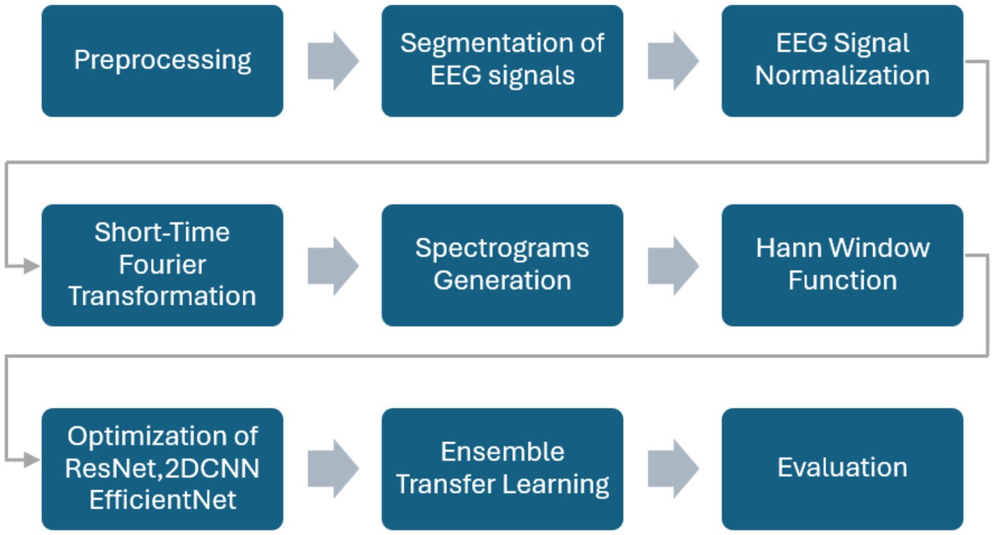 The proposed methodology uses an ensemble of optimized DL algorithms using transfer learning for personalized seizure detection. The publicly available CHB-MIT database is employed to train and optimize the models separately and subsequently combined to form an ensemble of the models. The dataset is explained in detail in the experiments section. Figure 1 exhibits the step-by-step process of the methods and materials used in the work. Raw EEG signals are preprocessed, normalized, and segmented. The STFT is applied to generate overlapping spectrogram windows. The spectrograms are then used for feature extraction and fed into pre-trained models (ResNet-18, EfficientNet-B0, and a 2DCNN). The models are optimized individually, combined into an ensemble, and finally evaluated using standard performance metrics.