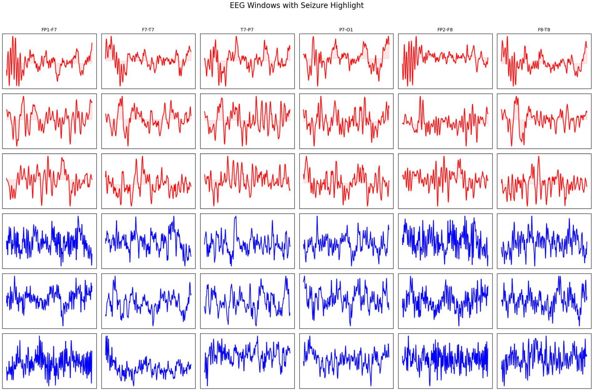Figure 3. EEG windows showing seizure (red) and non-seizure (blue) activity across different channels.