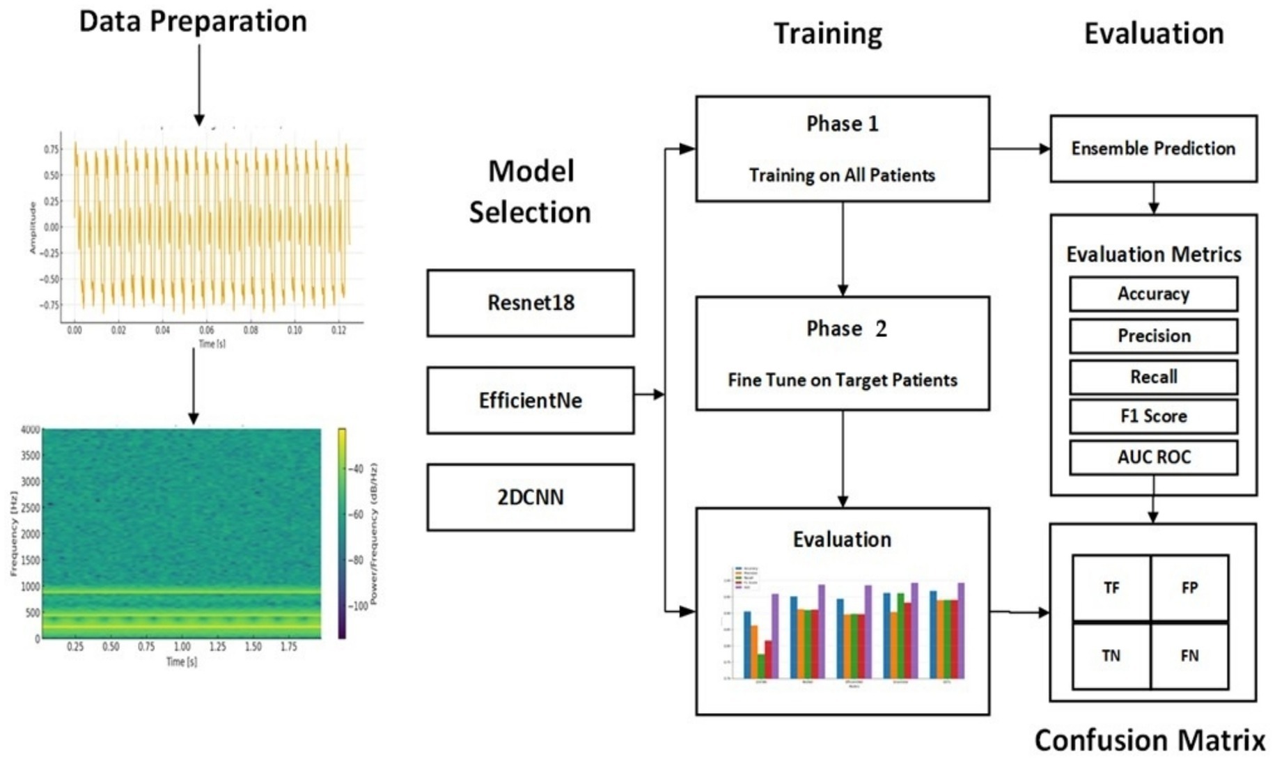 A 2-Phase training model is proposed for personalized seizure detection. The steps involved can be seen in Figure 4. Raw EEG signals are passed to the model as input and converted in window segments. Each segment is then converted into a spectrogram using STFT. Single channel 2D images represented frequency vs. time are generated as output to be passed to CNN-based deep transfer learning models as input. Ensemble of deep transfer learning models is then applied following a 2-Phase training approach for personalized seizure detection. Phase 1 is the base training phase, where the models are trained on all the patients except the target patient. The goal is to learn the general transferable seizure patterns. Phase 2 is the fine-tuning or personalization phase, where the base models are fine-tuned on part of patient’s data. The target patient’s data is split into training and validation data where the base models are fine-tuned on the training data of the target patient. This fine-tuning allows the models to adapt to the patient-specific EEG patterns. The learning rate in the fine-tuning phase is kept lower than the base training phase to avoid the pre trained weights from being destroyed. After the fine-tuning phase, each patient has three models. Ensemble of the models is then applied final predictions.