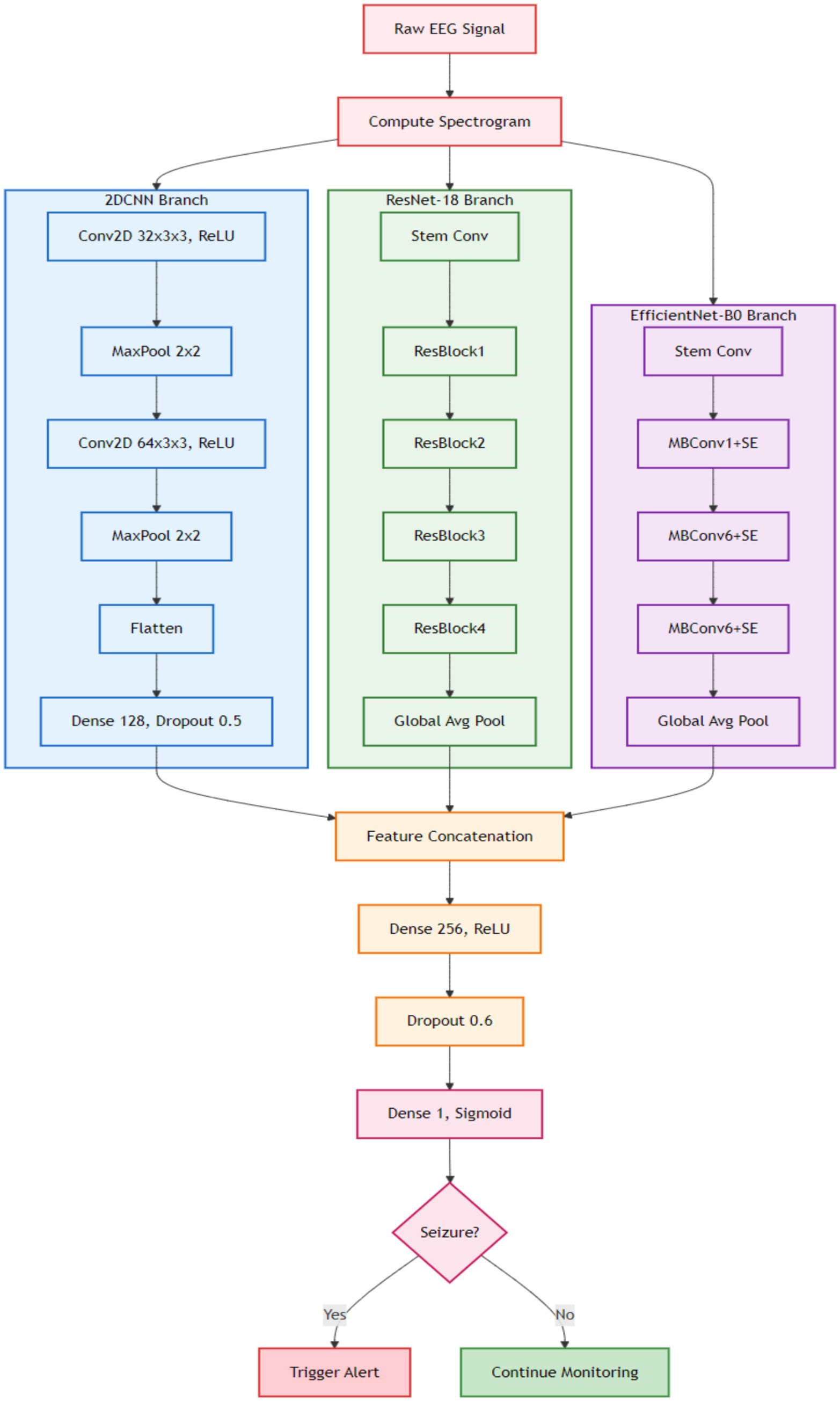 Raw EEG signals are transformed into spectrograms and are separately fed into each model, where each model independently extracts its own feature representation. The features extracted from the spectrograms are concatenated and passed to the next layer. Final predictions are then performed using the meta-model. The detailed structure of the proposed efficient model highlights the key components contributing to its improved performance, which can be seen in Figure 5.