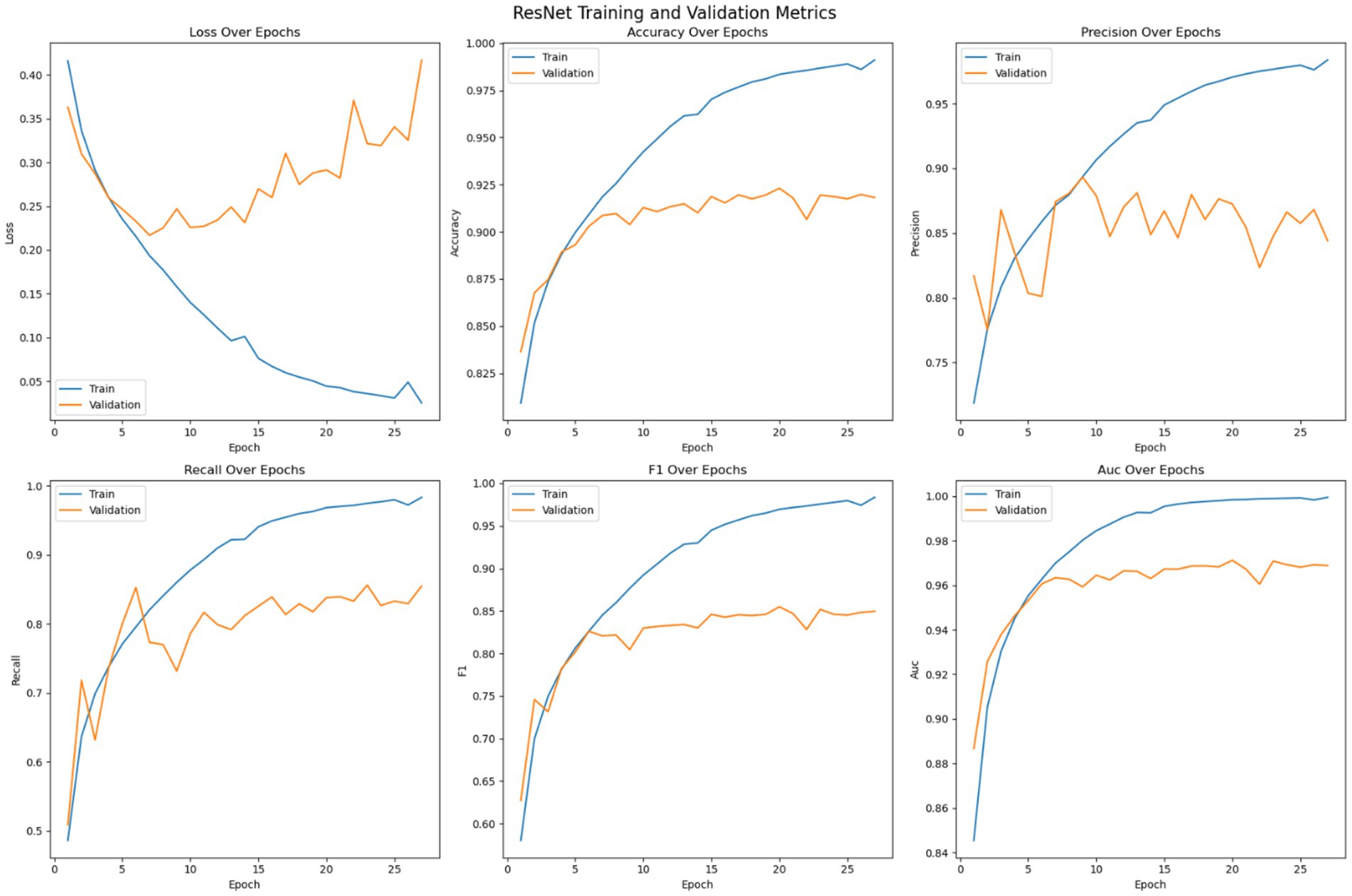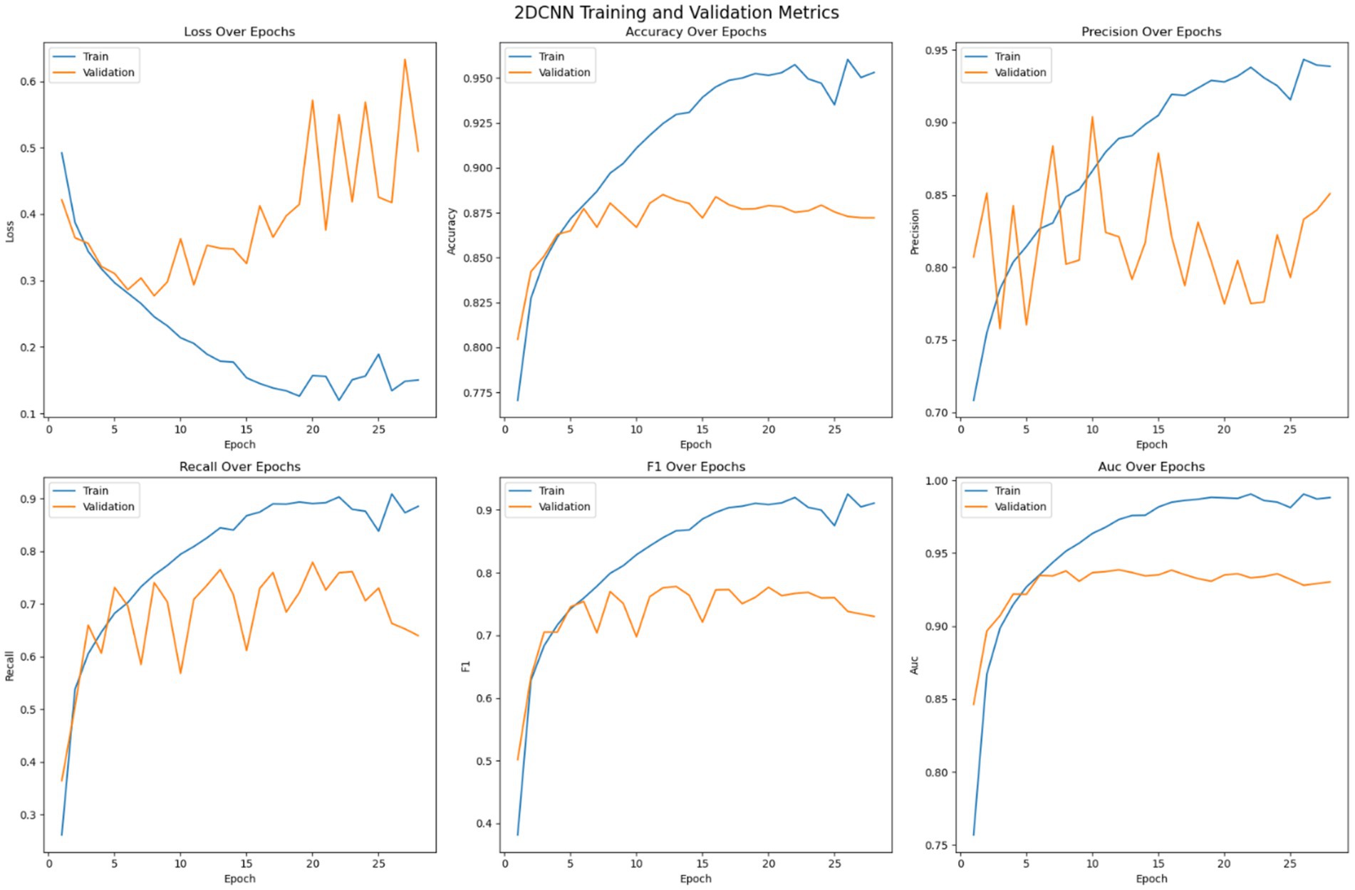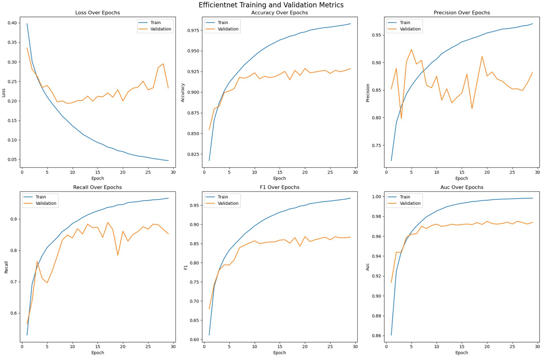 Figure 8 shows the optimization of the pre trained EfficientNet model on the given dataset. The loss error, precision, recall, accuracy, F1 measure and AUC have been reported for the training and validation set. The figure suggests that, unlike the customized 2DCNN and ResNet models, the EfficientNet model converges over more iterations and shows comparatively stable performance. The model shows less tendencies to over fit, with comparatively lower gaps between the training and validation loss. Moreover, the validation loss is stable over epochs as compared to other models, where the performance on the validation set decreases after certain iteration, indicating overfitting. Initially, both the training and validation loss decrease while the accuracy shows consistent improvement, with the training accuracy reaching up to 98% and the validation accuracy crossing 92%. Then the model generalizes better to the validation set across the validation metrics, with validation error showing improvement, and stabilizing over the subsequent epochs, while the accuracy of the model stabilizes. Again, early stopping is employed to avoid overfitting of the model. Precision performance of the model on training data shows steady improvement, reaching up to 98%, while the validation precision shows comparatively low variation with the best value reaching up to 90%. Recall metrics of the model shows continued improvement on the training data, reaching up to 98% and.