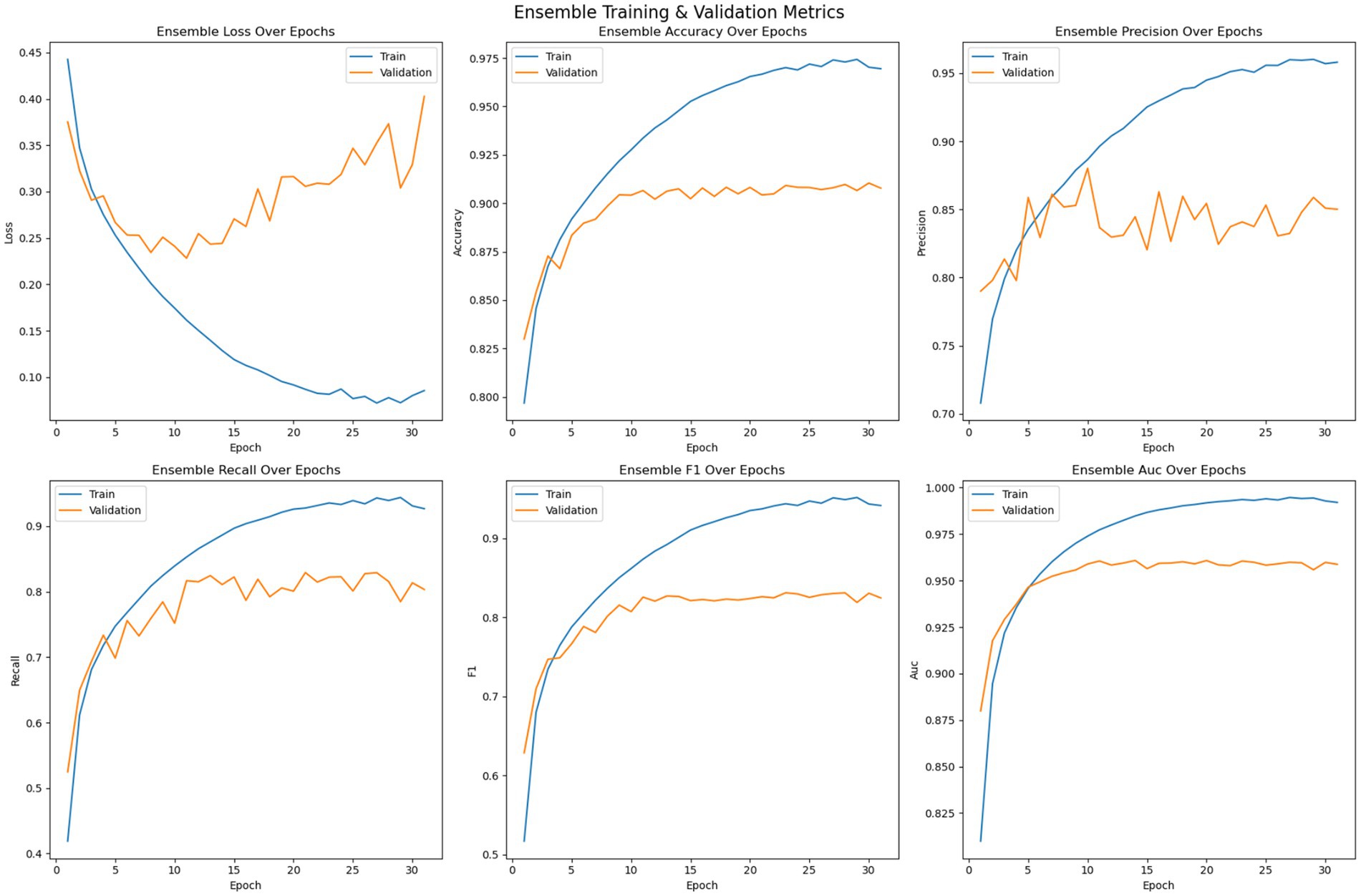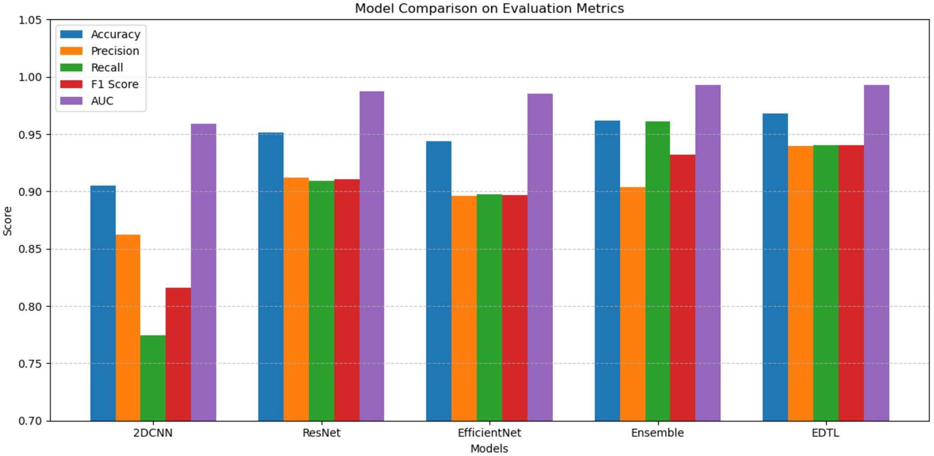 The EDTL model is an ensemble of 2DCNN, ResNet-18, and EfficientNet-B0, where features from each base model are extracted and concatenated for final classification. Unlike individual neural networks, the ensemble does not update weights during training; it only combines the predictions of the pre-trained base models. Therefore, epoch-wise training or validation loss/accuracy curves are not available for EDTL. Its performance is reported using final evaluation metrics (Accuracy, Precision, Recall, F1-score, AUC) on the test set. However, ensemble evaluation curves can be simulated epoch by averaging the evaluation metrics across the individual models, shown in Figure 9. Since each model might converge at the different number of epochs, the model with maximum number of epochs is identified and the missing epochs for the other models are padded with the last value to run the ensemble curves for as long as the longest trained model.