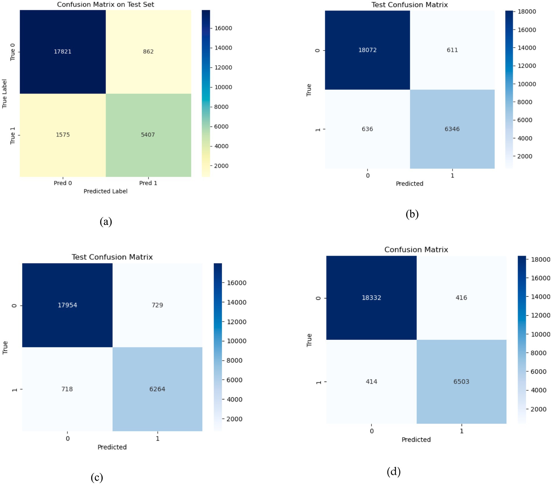 Figure 10. Confusion matrices for the models on test data; (a) for 2DCNN; (b) for ResNet18; (c) for EfficientNet-B0; (d) for EDTL.