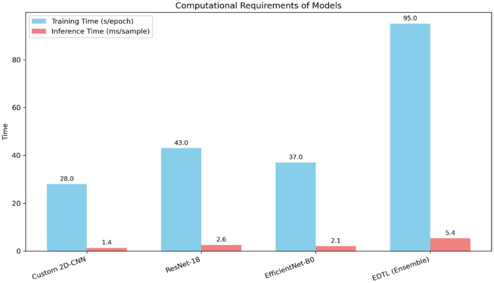 To further analyze the efficiency of the proposed methodology, the computational requirements of individual models and the ensemble were measured in terms of training time per epoch and inference time per sample, as illustrated in Figure 13. The figure compares training time per epoch (in seconds) and inference time per sample (in milliseconds) for Custom 2DCNN, ResNet-18, EfficientNet-B0, and the proposed ensemble (EDTL). The ensemble requires more computation but delivers superior performance and robustness across datasets.