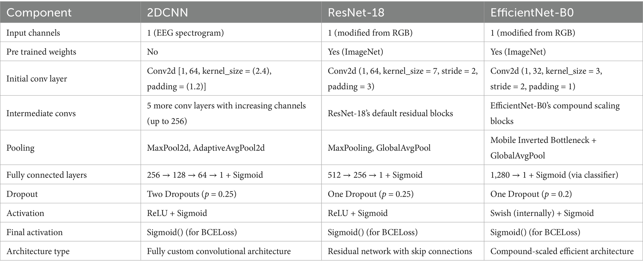 ResNet-18 architecture was used with transfer learning enabled, allowing the model to benefit from general image features, even when applied to spectrogram-based data. The input channels are modified to adapt the ResNet-18 for 1-channel data while retaining the architecture’s spatial feature extraction capacity. The classification head is also modified for binary classification. It reduces the dimensionality of the output features from ResNet’s last convolutional block. Fully connected 256-dimensional hidden layer is used to add representational capacity, allowing the network to learn higher level abstractions from the features extracted by the convolutional backbone. This transformation acts as a feature bottleneck, helping the model to prioritize the most informative components, such as seizures in EEG signals, while suppressing the less relevant information. To enable the model to separate data classes in high-dimensional feature spaces by learning non-linear, complex decision boundaries, Rectified Linear Unit (ReLU), a non-linear activation function, is applied. The model randomly drops 25% of the neurons during training. This acts as a regularize, mitigating the risk of overfitting—especially important when training on medical datasets like EEG data. Sigmoid activation function converts the single output logit into a probability in the range [0, 1], allowing the output to be interpreted as the likelihood of a seizure event. Similar modifications also applied for EfficientNet to adapt the model for processing single-channel EEG spectrogram and suiting to binary classification. The custom 2DCNN model is composed of six sequential convolutional layers, to extract hierarchical features from the input data, followed by an adaptive pooling layer, to adjust the special dimensions to a fixed size. Finally, fully connected layers are added to produce final predictions. The details of hyper parameters can be found in Table 1.