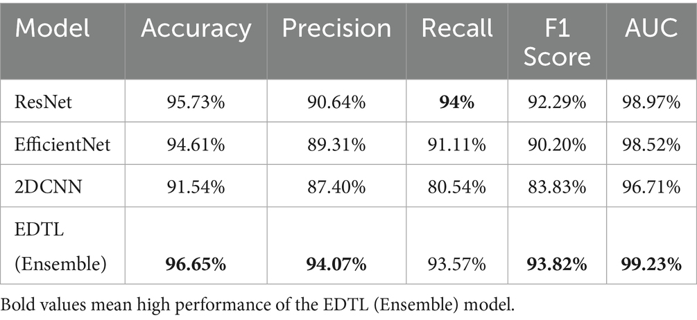 The EDTL model achieves a score of 96.65% for accuracy, score of 94.07% for precision, a recall score of 93.57%, a score of 93.82% for F1, and an AUC score of 99.23%. The performance of the EDTL compared to the other models suggests considerable improvement without increasing the complexity of the model. Figure 11 presents a comparative analysis of the AUC values obtained from the evaluated models. In Figure 11, Model 1 displays the ResNet18 method, Model 2 shows the EfficientNet-B0, and Model 3 shows the 2DCNN model. The proposed EDTL framework is shown by the Ensemble mechanism. The proposed framework significantly outperforms the other models on the AUC score, achieving a score of 99.23%. The ResNet method performs second best with an AUC score of 98.97%, followed by the EfficientNet method with a score of 98.52%. Although the customized 2DCNN shows good performance with an AUC score of 96.71%, the deep transfer learning-based models significantly outperform the model, with the proposed EDTL performing better overall than the other models, as shown in Figure 12.