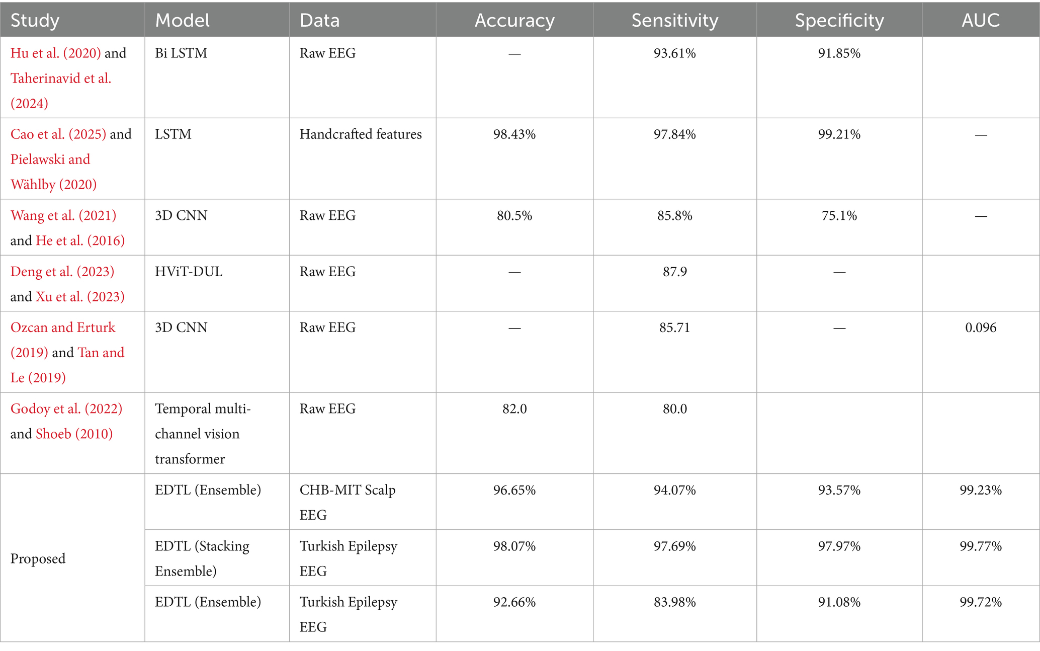 Compared to previous studies, the proposed ensemble models showed clear improvements in performance. Earlier works, such as those by Taherinavid et al. (2024), Wang et al. (2021), He et al. (2016), and Godoy et al. (2022), and Shoeb (2010) achieved moderate accuracy and sensitivity, while methods relying on handcrafted features, such as Cao et al. (2025) and Pielawski and Wählby (2020), performed strongly but were limited by feature engineering requirements. The slightly lower performance of our proposed methodology on the CHB-MIT Scalp EEG dataset compared to Cao et al. (2025), Pielawski and Wählby, (2020) (96.65% vs. 98.43%) may be due to differences in preprocessing and feature engineering. Cao et al. relied on handcrafted features with an LSTM model, whereas our method uses an ensemble-based approach without handcrafted features.