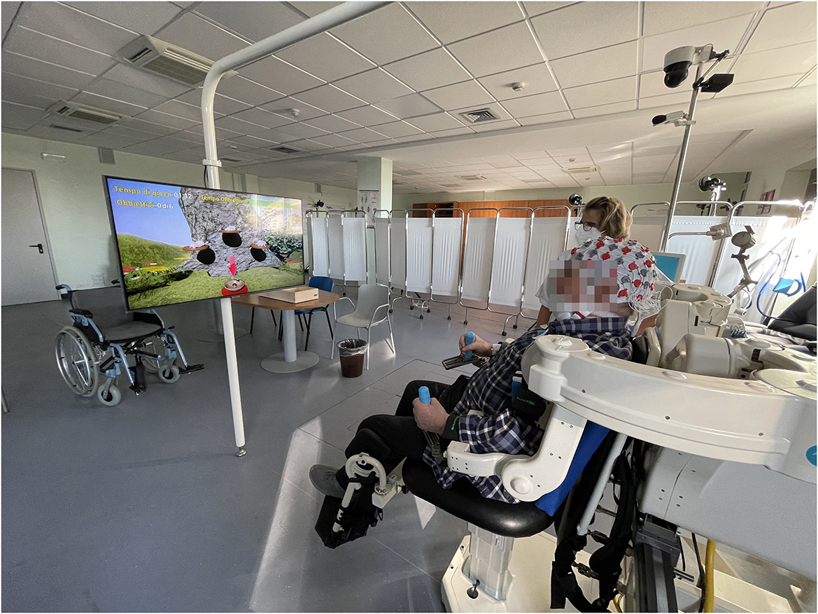 In the UG, patients utilized the ALEx RS robot in its unilateral configuration to perform upper limb movements with the affected arm, accompanied by the relevant VR exergames. Conversely, in the BG, the ALEx RS robot was employed in its bilateral configuration alongside the corresponding VR exergames. Both groups performed rehabilitation treatments in the presence of a physical therapist and an engineer. Details about unilateral and bilateral treatments are reported in our previous paper (Mauro et al., 2024).