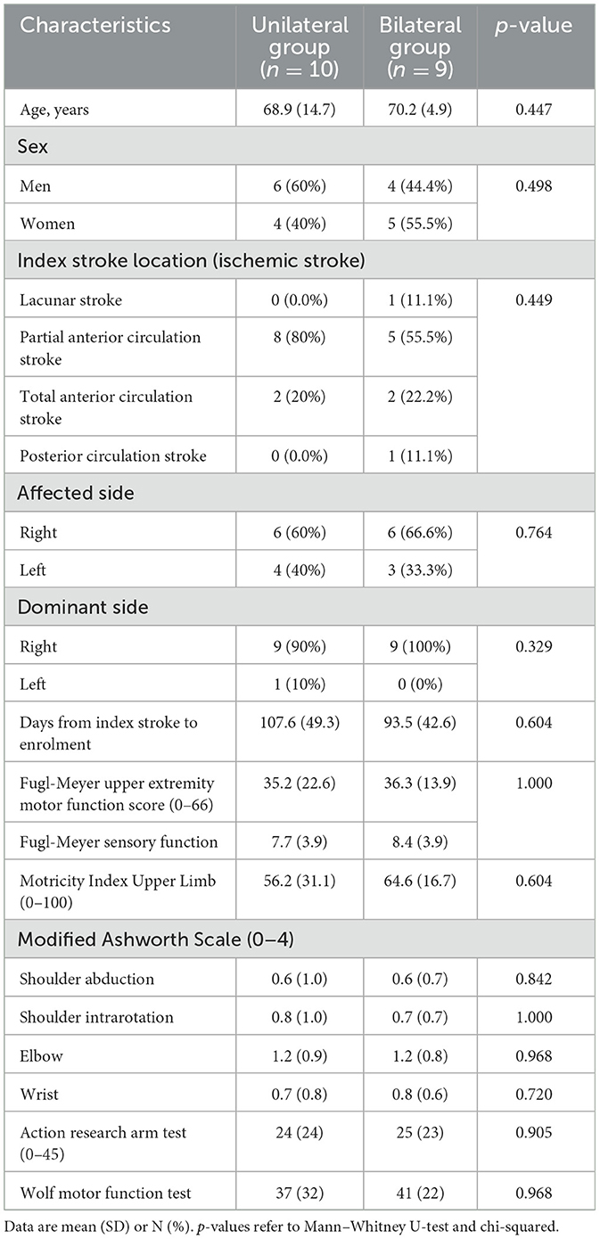 We enrolled consecutive subjects with stroke, verified by Magnetic Resonance Imaging (MRI) or Computed Tomography (CT). Patients were enrolled at the Santa Maria della Provvidenza Centre of Fondazione Don Carlo Gnocchi ONLUS, in Rome (Italy) between January 2022 and November 2022. The eligibility criteria were: (1) age between 18 and 85 years; (2) ischemic stroke; (3) first cortical and supratentorial event; (4) moderate upper extremity motor deficit (evaluated by Fugl-Meyer Assessment for Upper Extremity score between 29 and 42); (5) time since the acute event between 1 month and 6 months; (6) Trunk Control Test score greater than or equal to 48. Exclusion criteria were: (1) significant medical comorbidity (such as severe neurological disease, cardiovascular disease, diabetes/unstable hypertension); (2) cognitive impairment that prevents comprehension of commands and administered exercises; (3) inability or unwillingness to provide informed consent. All participants gave their written informed consent according to the Declaration of Helsinki. This is a secondary analysis of a pilot randomized controlled trial (RCT), designed to compare the effects of unilateral vs. bilateral upper limb rehabilitation using a bilateral upper limb exoskeleton in patients with subacute stroke (Mauro et al., 2024). The trial was approved by the Ethics Committee of Lazio 1 (609/CE Lazio 1) and registered at ClinicalTrials.gov with identifier number NCT05176600.