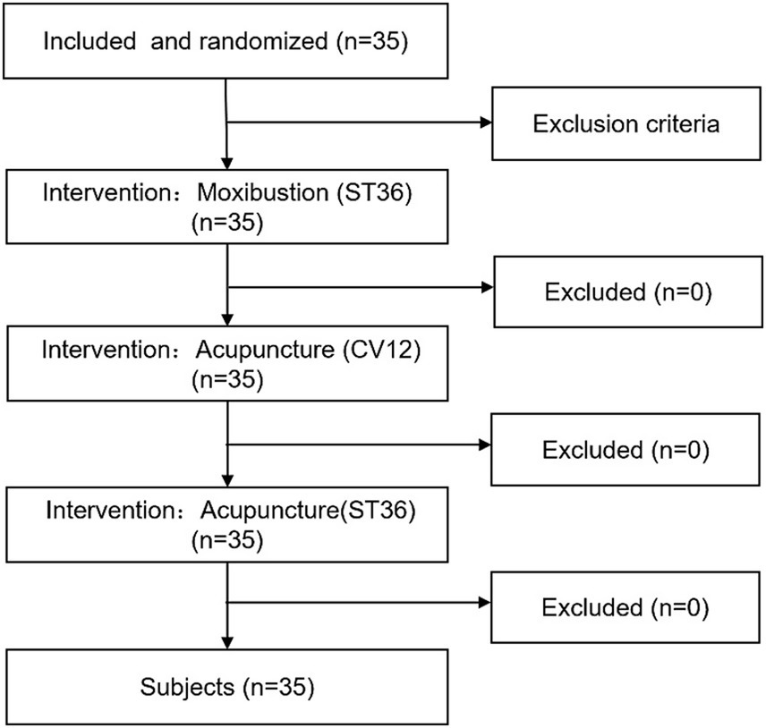 A Self-comparison design was conducted and a pilot study (n = 15) was carried out among healthy young individuals prior to the main study. On the basis of the pre-experimental SDNN data, sample size calculations were performed. The mean difference in the SDNN between acupuncture at ST36 and moxibustion at ST36 was 5 ms, with a significance level of 0.05, a power of 0.9, and a potential drop-out rate of 0.1, the required sample size was determined that to be 35 participants. The participants were recruited from Hunan University of Medicine. We randomized the order of therapies. The participants underwent three interventions in sequence: moxibustion at ST36, acupuncture at ST36 and acupuncture at CV12, with a one-day washout period between interventions. During the study, the participants were in the supine position. The procedures were rigorously performed by 5 acupuncturists who underwent 1 week of standardized training and evaluation according to the protocol. Blinding was implemented for both HRV data entry personnel and result evaluators. The study flow chart is shown in Figure 1. This study was conducted in accordance with the tenets of the Declaration of Helsinki, and the protocol was approved by the Ethics Committee of Hunan University of Medicine, approval number: 2022 (H01001). Clinical Trial Registration Number: ITMCTR2025001289. All the participants volunteered and signed an informed consent form.