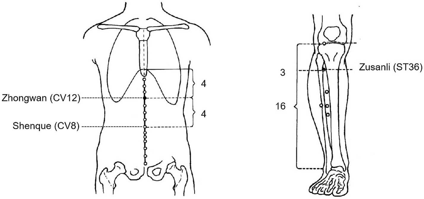 “Zhongwan” (CV12) is located at the midpoint between the xiphosternal synchondrosis and the umbilicus, 4 cun (body-specific unit in TCM) above the umbilicus. “Zusanli” (ST36) is located 3 cun below Dubi (ST35), on the line connecting Dubi (ST35) and Jiexi (ST41) (see Figure 2).