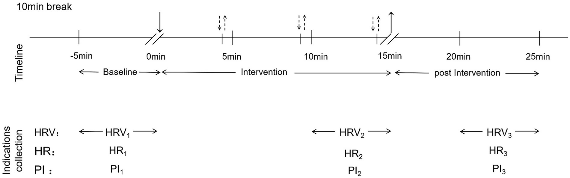 The short-term 5-min recording method was employed (Perulli et al., 2023). The participants were instructed to ensure adequate sleep and to refrain from vigorous exercise, alcohol, strong tea and coffee the night before the test. Electrocardiogram data were collected via an HR monitor pre-intervention, during the 10–15 min of the intervention, and 5–10 min post-intervention. The participants lay down for 10 min before collection, and the supine position was used throughout the test. During ECG acquisition, limb movement was avoided, the environment was kept quiet, and the room temperature was maintained at 25 ± 1 °C. Parameters such as SDNN and RMSSD for time domain analysis, TP, LF and HF for frequency domain analysis, and SD1, SD2 and SD1/SD2 for non-linear measures were selected to assess overall ANS activity, vagal activity, sympathetic activity and sympathetic-vagal balance.