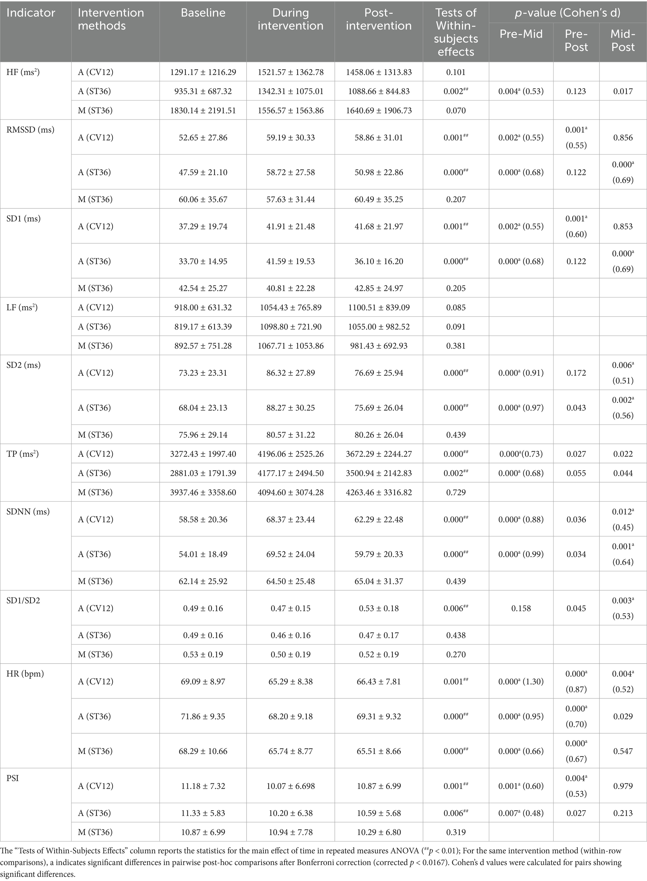 Compared with the baseline, HF, RMSSD and SD1 (p = 0.004, d = 0.53; p < 0.001, d = 0.68; p < 0.001, d = 0.68) increased during acupuncture at ST36 and no statistically significant differences were detected post-acupuncture (p = 0.123, p = 0.122, p = 0.122). Compared with that during acupuncture, RMSSD and SD1 decreased post-acupuncture (p < 0.001, d = 0.69; p < 0.001, d = 0.69).
