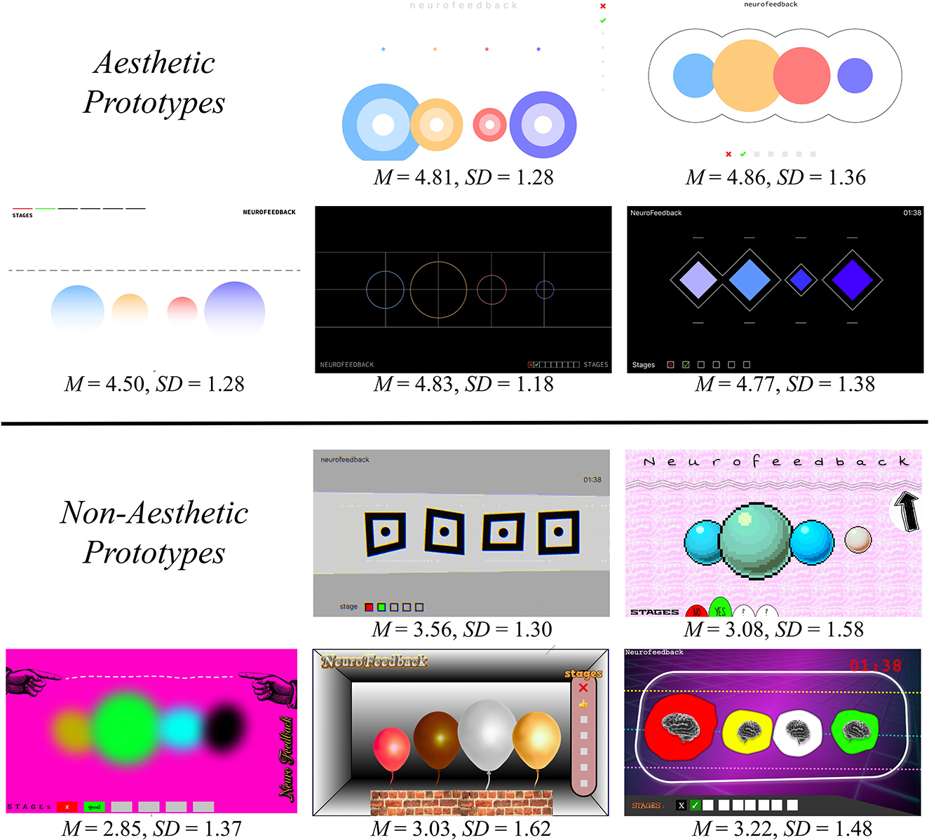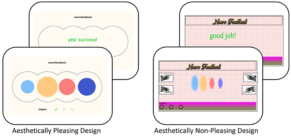 The goal of the study at hand is two-fold. First, the effects of aesthetics on objective and subjective outcome variables of NFB are evaluated in the non-responder context. Note, this study manipulates NFB non-responders with an S-NFB procedure, giving participants the illusion of success or no success (see Section 2.2). Second, the sham feedback design allows for disentangling NFB effects from effects inherent to the NFB design on the neurophysiological level.