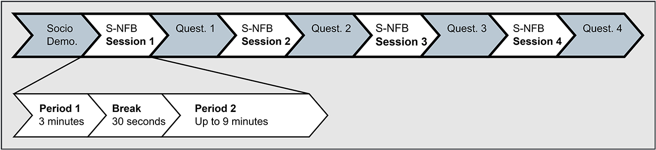 The EEG was applied, and participants were reminded of the non-invasive nature of EEG measurements. When impedance measures below 20 kOhm were achieved, a 3-min eyes-open EEG baseline measurement was carried out during which participants were advised to look at a fixation cross and to blink as little as possible to avoid eye movements and blink artifacts. The main part of the experiment consisted of four S-NFB sessions corresponding to the four experimental conditions. Each S-NFB session consisted of an initial fixed period of 3 min, followed by an optional second period ranging from 0 to 9 min, the duration of which was determined by the participant. The voluntary second period length indicated participants' perseverance. After each S-NFB session, visual aesthetics (VisAWI short scale, Moshagen and Thielsch, 2013), motivation (SIMS; Guay et al., 2000), and workload (NASA-TLX; Hart and Staveland, 1998) were assessed (see Figure 3).