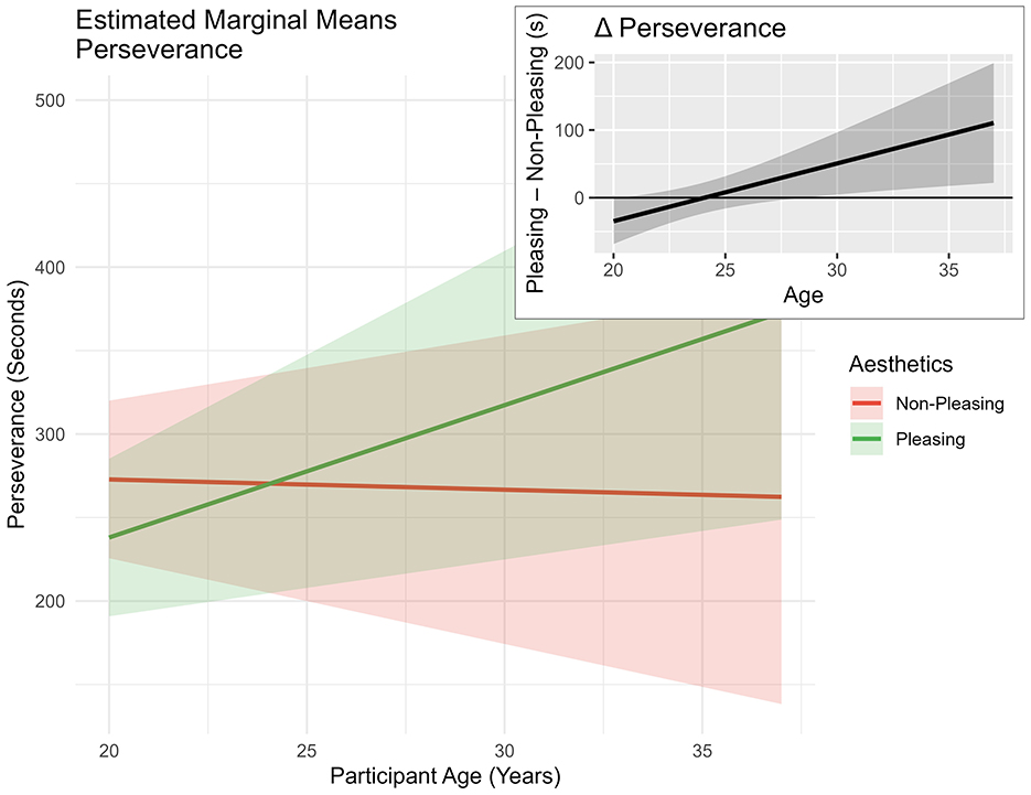 Figure 4. Estimated marginal means of “perseverance” predicted by “aesthetics” and “age.” Based on the mixed model. Age was centered with the sample mean. Shaded areas represent ±1 standard error of the mean (SEM).