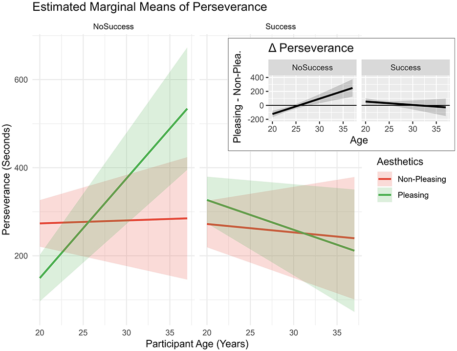 Figure 5. Estimated marginal means of perseverance predicted by “illusion of success,” “Aesthetics,” and “age.” Based on the mixed model. Age was centered with the sample mean. Shaded areas represent ±1 standard error of the mean (SEM).