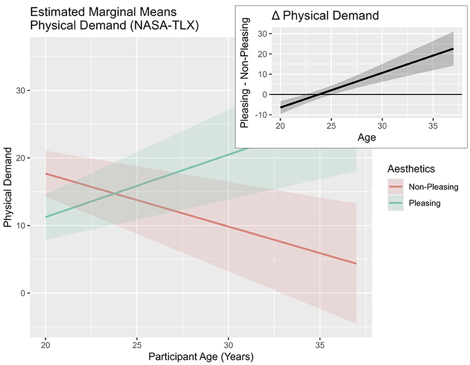 Figure 6. Estimated marginal means plot of double interaction effects on “physical demand” (NASA-TLX) predicted by “aesthetics” * “age.” Plot based on the fitted linear mixed-effects model. Age was centered with the sample mean. Shaded areas represent ±1 standard error of the mean (SEM).
