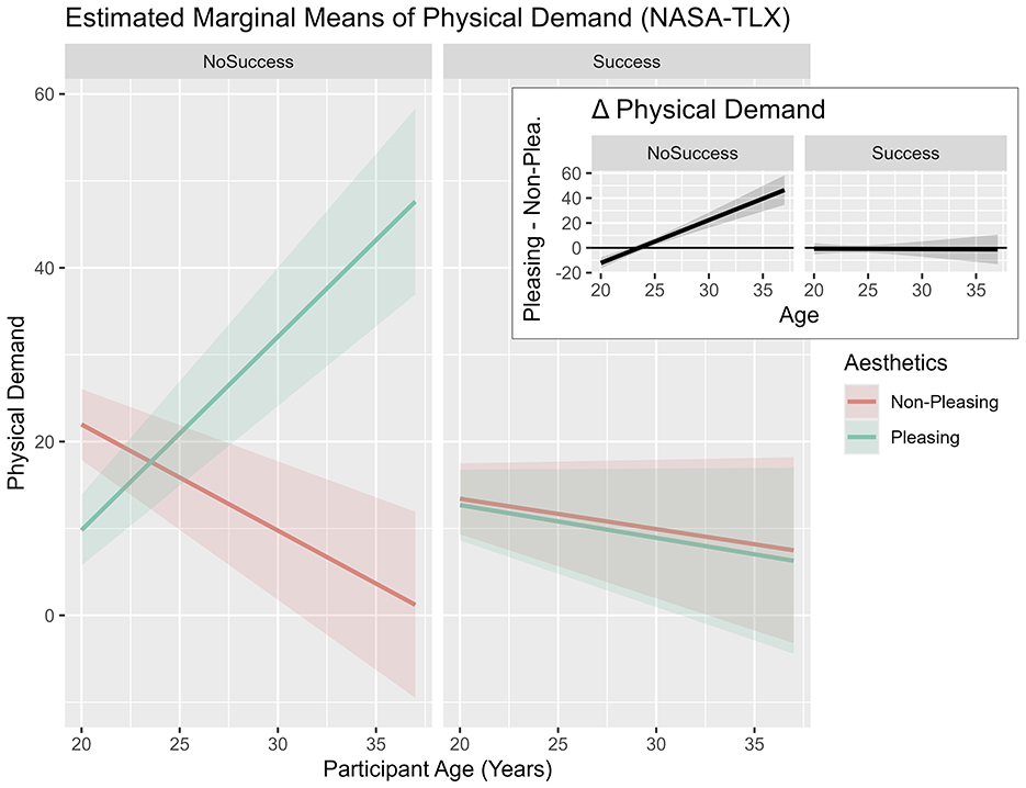 Figure 7. Estimated marginal means plot of triple interaction effects on “physical demand” (NASA-TLX) predicted by “aesthetics,” “illusion of success,” and “age.” Plot based on the fitted linear mixed-effects model. Age was centered with the sample mean. Shaded areas represent ±1 standard error of the mean (SEM).